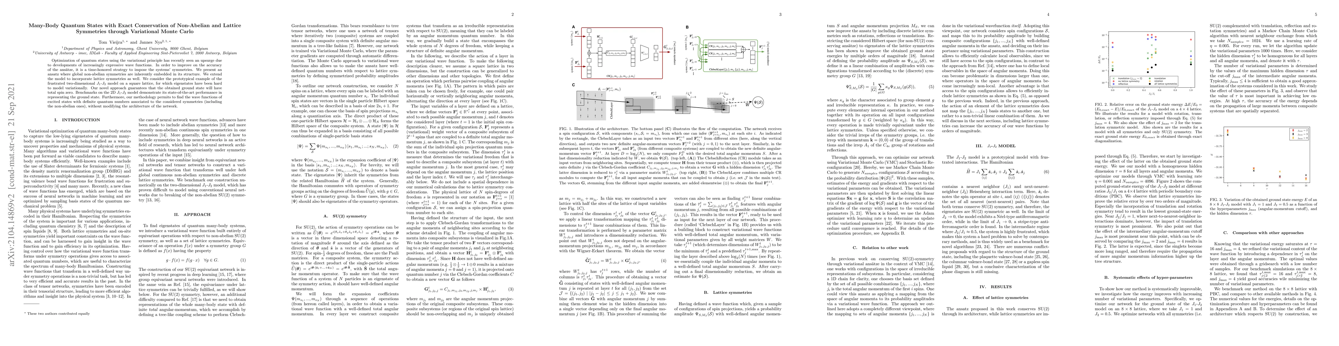 Optimization of quantum states using the variational principle has recently seen an upsurge due to developments of increasingly expressive wave functions. In order to improve on the accuracy of the ans\"atze, it is a time-honored strategy to impose the systems' symmetries. We present an ansatz where global non-abelian symmetries are inherently embedded in its structure. We extend the model to incorporate lattice symmetries as well. We consider the prototypical example of the frustrated two-dimensional $J_1$-$J_2$ model on a square lattice, for which eigenstates have been hard to model variationally. Our novel approach guarantees that the obtained ground state will have total spin zero. Benchmarks on the 2D $J_1$-$J_2$ model demonstrate its state-of-the-art performance in representing the ground state. Furthermore, our methodology permits to find the wave functions of excited states with definite quantum numbers associated to the considered symmetries (including the non-abelian ones), without modifying the architecture of the network.