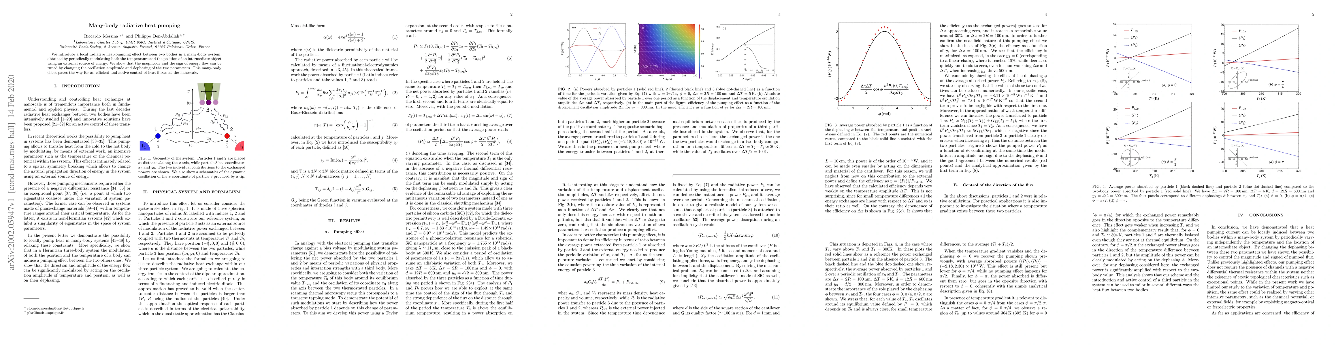 We introduce a local radiative heat-pumping effect between two bodies in a many-body system, obtained by periodically modulating both the temperature and the position of an intermediate object using an external source of energy. We show that the magnitude and the sign of energy flow can be tuned by changing the oscillation amplitude and dephasing of the two parameters. This many-body effect paves the way for an efficient and active control of heat fluxes at the nanoscale.