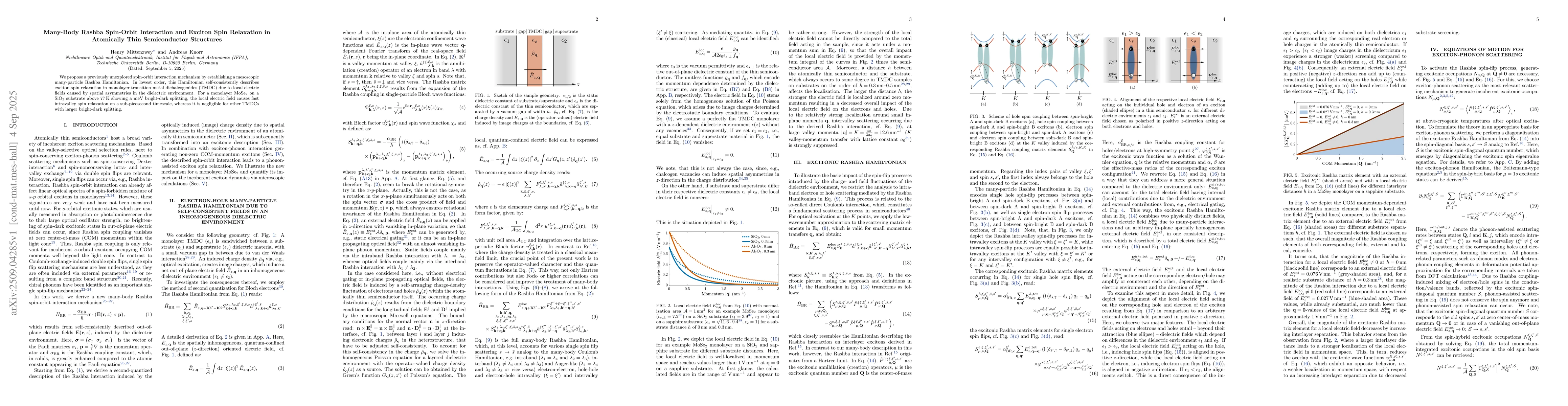 We propose a previously unexplored spin-orbit interaction mechanism by establishing a mesoscopic many-particle Rashba Hamiltonian. In lowest order, this Hamiltonian self-consistently describes exciton spin relaxation in monolayer transition metal dichalcogenides (TMDC) due to local electric fields caused by spatial asymmetries in the dielectric environment. For a monolayer MoSe$_2$ on a SiO$_2$ substrate above 77\,K showing a meV bright-dark splitting, the local electric field causes fast intravalley spin relaxation on a sub-picosecond timescale, whereas it is negligible for other TMDCs with larger bright-dark splitting.