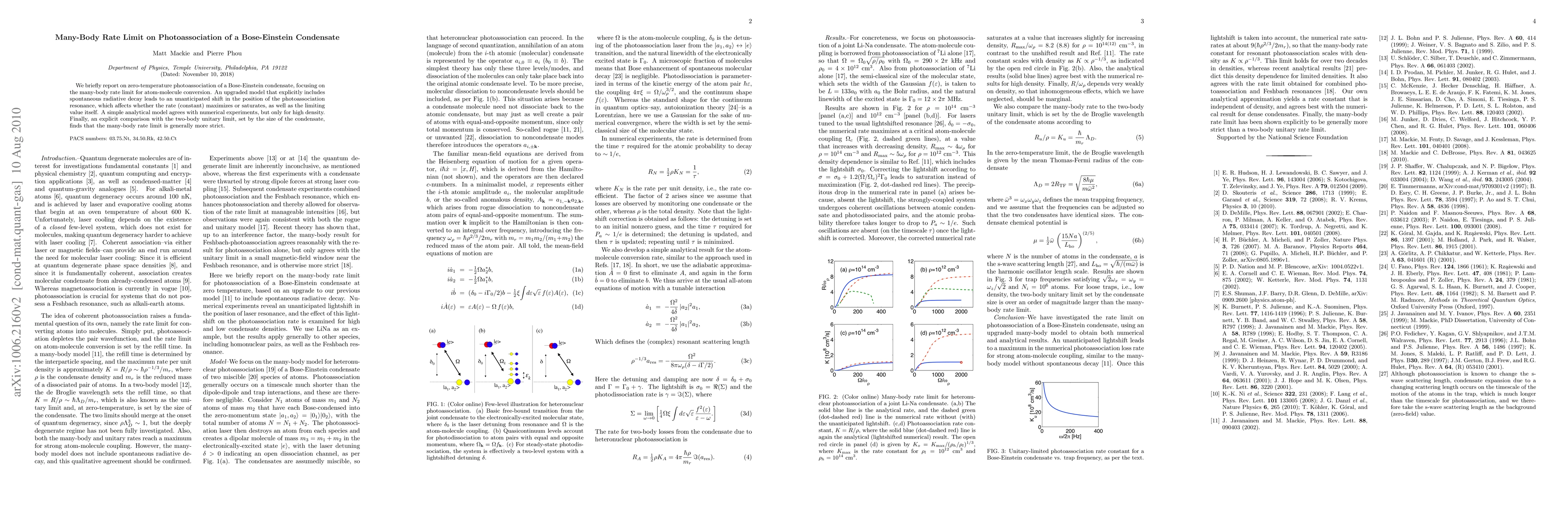 We briefly report on zero-temperature photoassociation of a Bose-Einstein condensate, focusing on the many-body rate limit for atom-molecule conversion. An upgraded model that explicitly includes spontaneous radiative decay leads to an unanticipated shift in the position of the photoassociation resonance, which affects whether the rate (constant) maximizes or saturates, as well as the limiting value itself. A simple analytical model agrees with numerical experiments, but only for high density. Finally, an explicit comparison with the two-body unitary limit, set by the size of the condensate, finds that the many-body rate limit is generally more strict.
