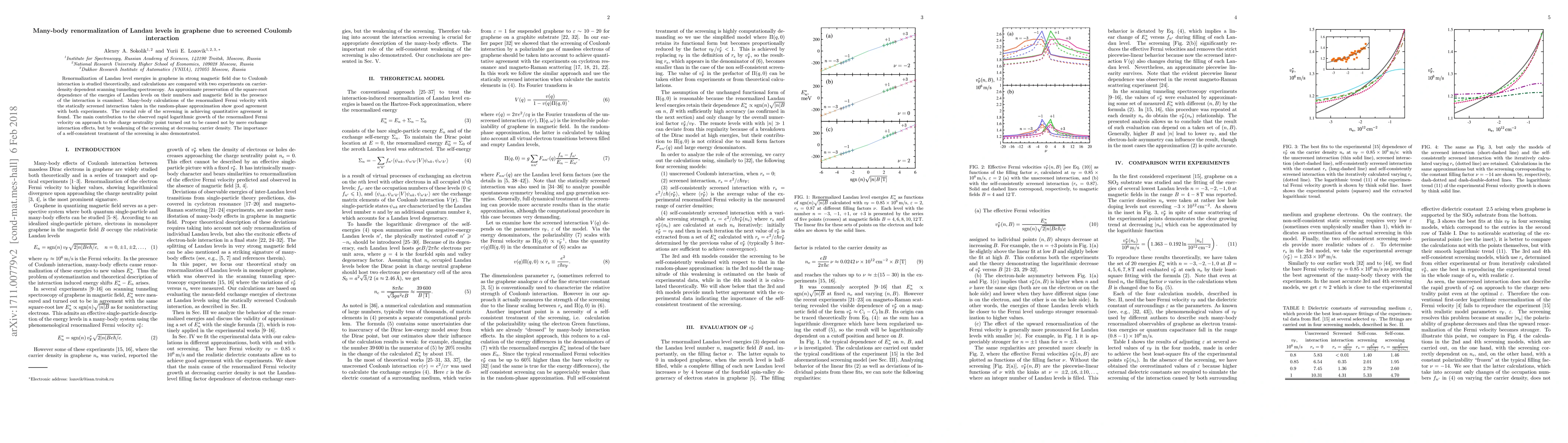 This paper investigates the renormalization of Landau levels in graphene under strong magnetic fields due to screened Coulomb interactions. Many-body calculations, incorporating the screened interaction via the random-phase approximation, demonstrate agreement with experimental data, highlighting the critical role of screening in achieving quantitative results and the impact of decreasing carrier density on the renormalized Fermi velocity.