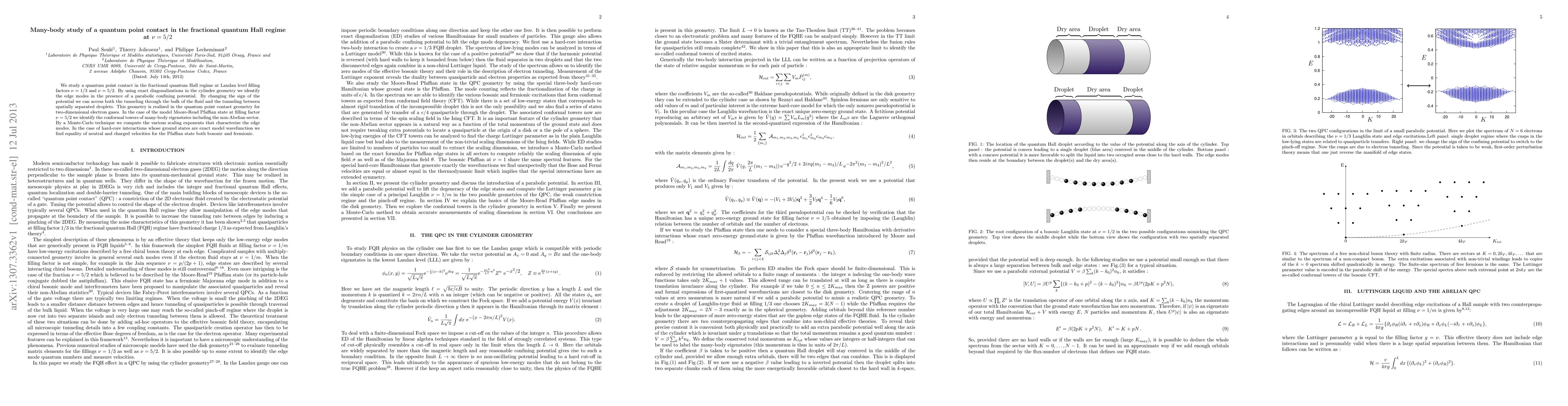 We study a quantum point contact in the fractional quantum Hall regime at Landau level filling factors 1/3 and 5/2. By using exact diagonalizations in the cylinder geometry we identify the edge modes in the presence of a parabolic confining potential. By changing the sign of the potential we can access both the tunneling through the bulk of the fluid and the tunneling between spatially separated droplets. This geometry is realized in the quantum point contact geometry for two-dimensional electron gases. In the case of the model Moore-Read Pfaffian state at filling factor 5/2 we identify the conformal towers of many-body eigenstates including the non-Abelian sector. By a Monte-Carlo technique we compute the various scaling exponents that characterize the edge modes. In the case of hard-core interactions whose ground states are exact model wavefunction we find equality of neutral and charged velocities for the Pfaffian state both bosonic and fermionic.