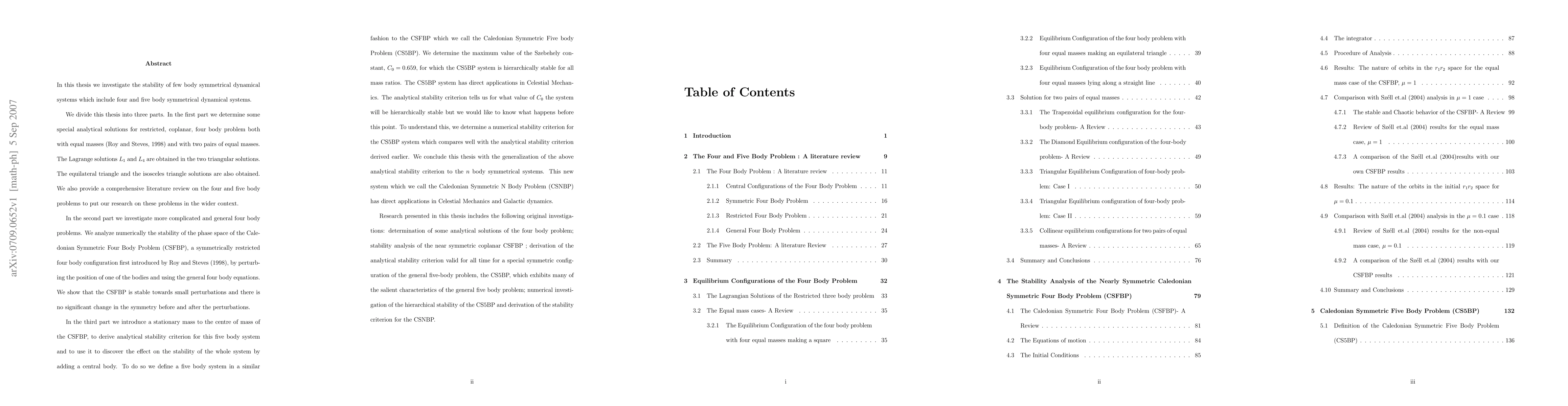 We investigate the stability of few body symmetrical dynamical systems which include four and five body symmetrical dynamical systems. Research presented in this thesis includes the following original investigations: determination of some analytical solutions of the four body problem; stability analysis of the near symmetric coplanar CSFBP ; derivation of the analytical stability criterion valid for all time for a special symmetric configuration of the general five-body problem, the CS5BP, which exhibits many of the salient characteristics of the general five body problem; numerical investigation of the hierarchical stability of the CS5BP and derivation of the stability criterion for the CSNBP.
