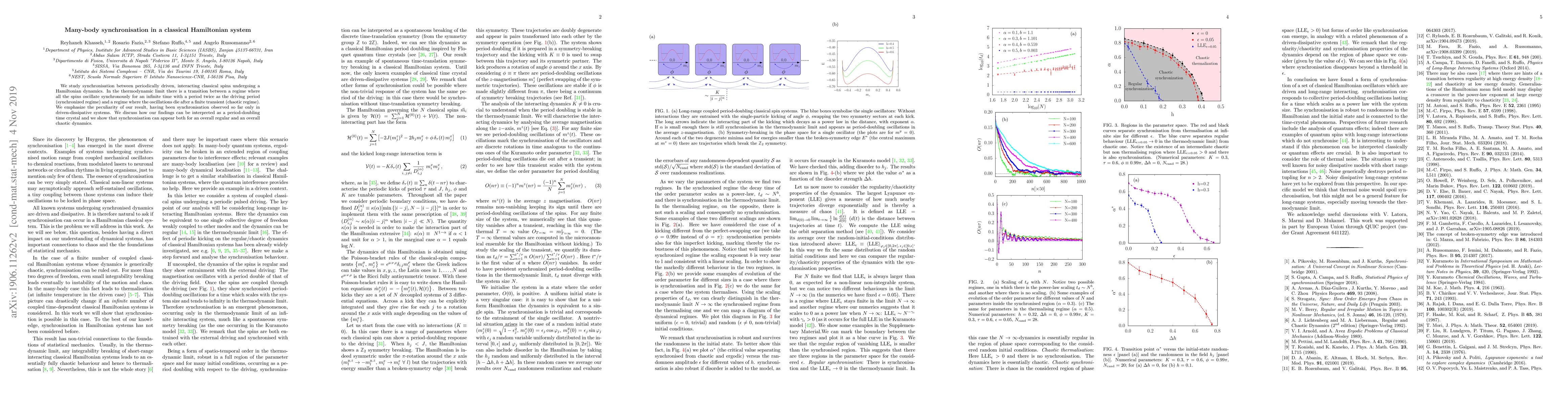 The study investigates many-body synchronisation in a classical Hamiltonian system of periodically driven, interacting classical spins undergoing Hamiltonian dynamics. It explores the transition between a synchronized regime, where spins oscillate synchronously with a period twice the driving period, and a chaotic regime where oscillations die out after a finite transient.