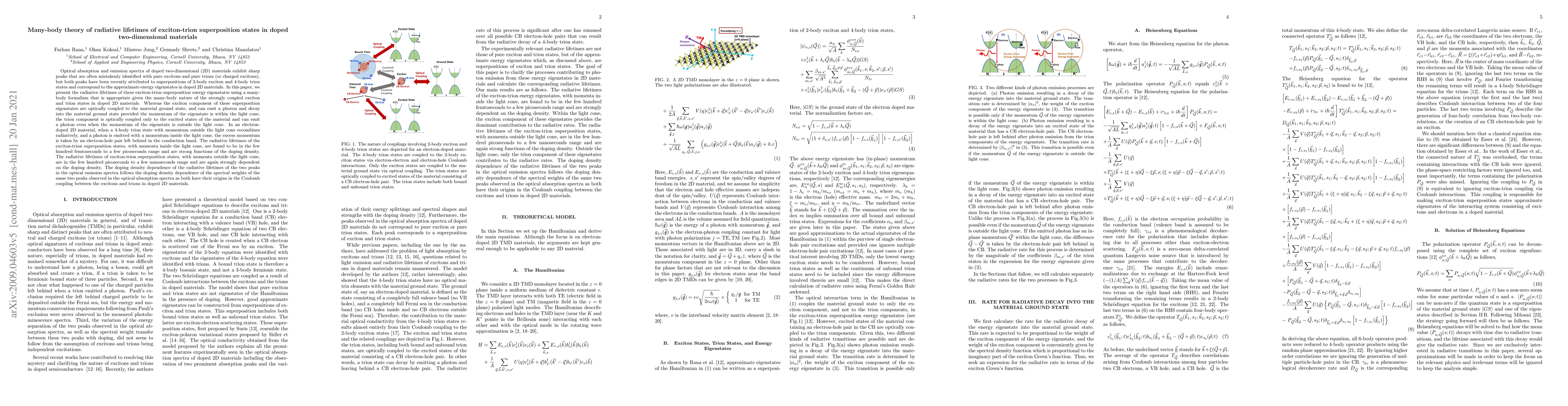 Optical absorption and emission spectra of doped two-dimensional (2D) materials exhibit sharp peaks that are often identified with pure excitons and pure trions (or charged excitons), but both peaks have been recently attributed to superpositions of 2-body exciton and 4-body trion states and correspond to the approximate energy eigenstates in doped 2D materials. In this paper, we present the radiative lifetimes of these exciton-trion superposition energy eigenstates using a many-body formalism that is appropriate given the many-body nature of the strongly coupled exciton and trion states in doped 2D materials. Whereas the exciton component of these superposition eigenstates are optically coupled to the material ground state, and can emit a photon and decay into the material ground state provided the momentum of the eigenstate is within the light cone, the trion component is optically coupled only to the excited states of the material and can emit a photon even when the momentum of the eigenstate is outside the light cone. In an electron-doped 2D material, when a 4-body trion state with momentum outside the light cone recombines radiatively, and a photon is emitted with a momentum inside the light cone, the excess momentum is taken by an electron-hole pair left behind in the conduction band. The radiative lifetimes of the exciton-trion superposition states, with momenta inside the light cone, are found to be in the few hundred femtoseconds to a few picoseconds range and are strong functions of the doping density. The radiative lifetimes of exciton-trion superposition states, with momenta outside the light cone, are in the few hundred picoseconds to a few nanoseconds range and are again strongly dependent on the doping density.