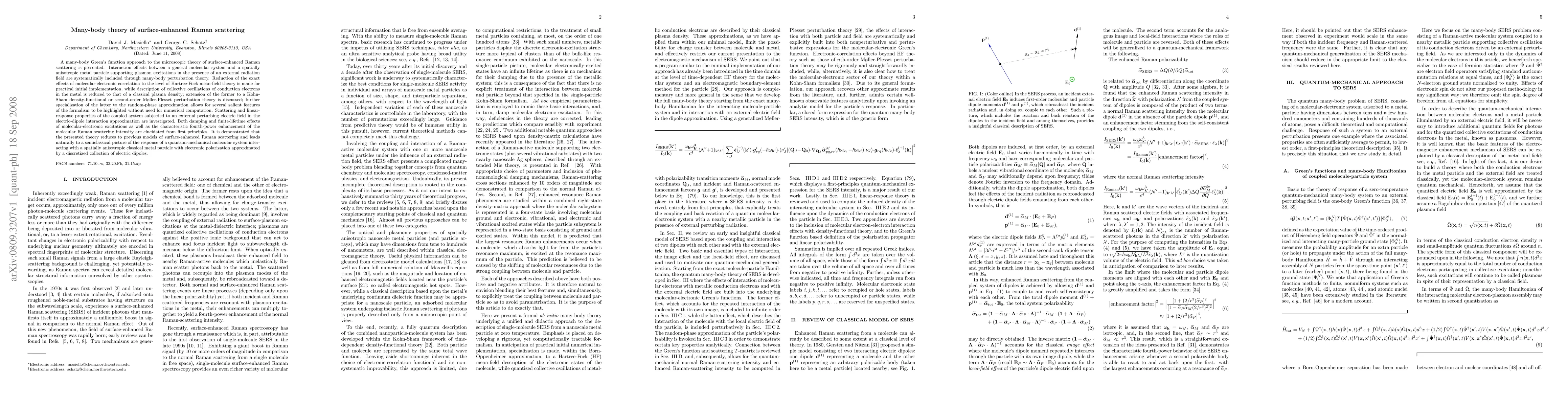 This paper develops a many-body theory for surface-enhanced Raman scattering using Green's function approaches, incorporating molecular-electronic interactions and plasmon excitations in metals. The theory elucidates enhancement mechanisms and connects to prior models, presenting a semiclassical picture of quantum-molecular systems interacting with classical metal particles.