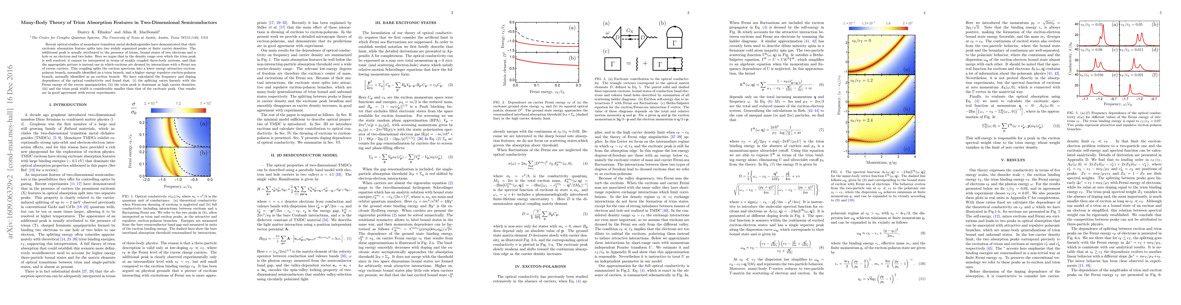Recent optical studies of monolayer transition metal dechalcogenides have demonstrated that their excitonic absorption feature splits into two widely separated peaks at finite carrier densities. The additional peak is usually attributed to the presence of trions, bound states of two electrons and a hole or an electron and two holes. Here we argue that in the density range over which the trion peak is well resolved, it cannot be interpreted in terms of weakly coupled three-body systems, and that the appropriate picture is instead one in which excitons are dressed by interactions with a Fermi sea of excess carriers. This coupling splits the exciton spectrum into a lower energy attractive exciton-polaron branch, normally identified as a trion branch, and a higher energy repulsive exciton-polaron branch, normally identified as an exciton branch. We have calculated the frequency and doping dependence of the optical conductivity and found that: (i) the splitting varies linearly with the Fermi energy of the excess quasiparticles; (ii) the trion peak is dominant at high carrier densities; (iii) and the trion peak width is considerably smaller than that of the excitonic peak. Our results are in good agreement with recent experiments.