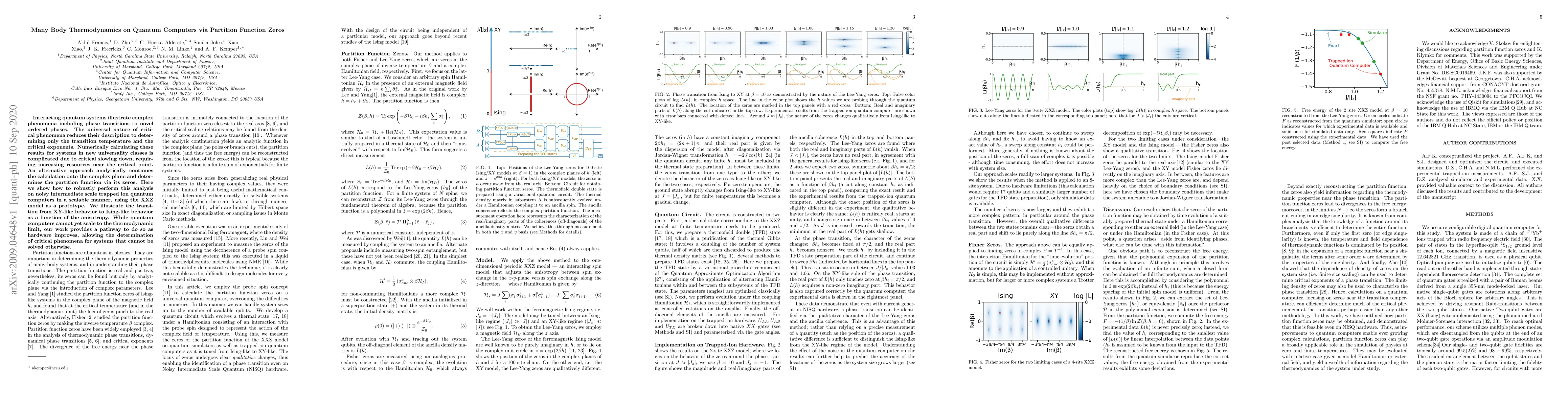 Interacting quantum systems illustrate complex phenomena including phase transitions to novel ordered phases. The universal nature of critical phenomena reduces their description to determining only the transition temperature and the critical exponents. Numerically calculating these results for systems in new universality classes is complicated due to critical slowing down, requiring increasing resources near the critical point. An alternative approach analytically continues the calculation onto the complex plane and determines the partition function via its zeros. Here we show how to robustly perform this analysis on noisy intermediate scale trapped ion quantum computers in a scalable manner, using the XXZ model as a prototype. We illustrate the transition from XY-like behavior to Ising-like behavior as a function of the anisotropy. While quantum computers cannot yet scale to the thermodynamic limit, our work provides a pathway to do so as hardware improves, allowing the determination of critical phenomena for systems that cannot be solved otherwise.
