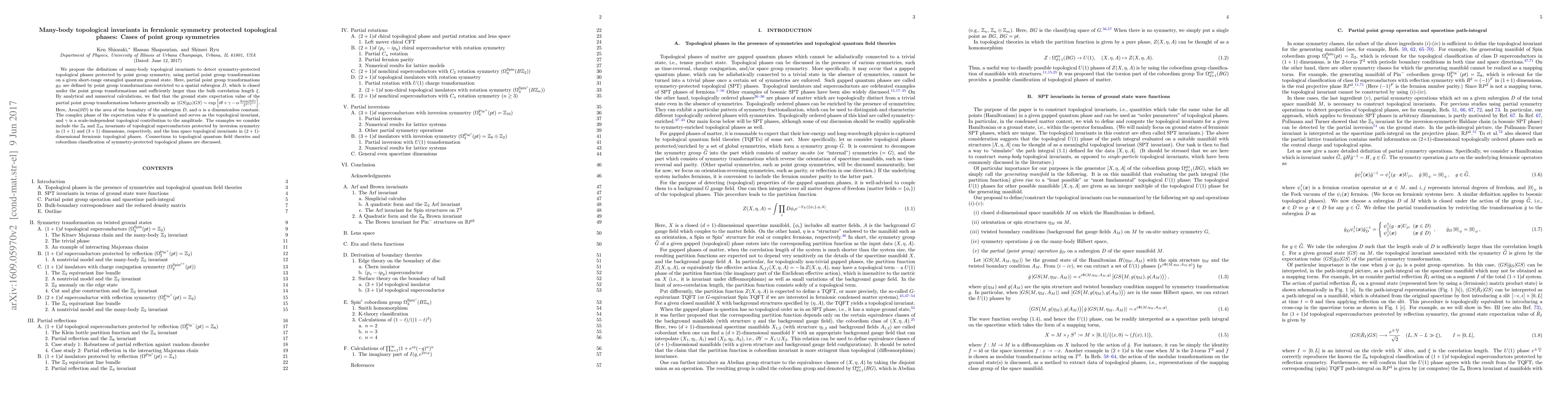 This paper proposes definitions for many-body topological invariants to identify symmetry-protected topological phases protected by point group symmetries. The invariants are derived from the behavior of partial point group transformations on short-range entangled quantum ground states, revealing quantized complex phases that serve as topological invariants.