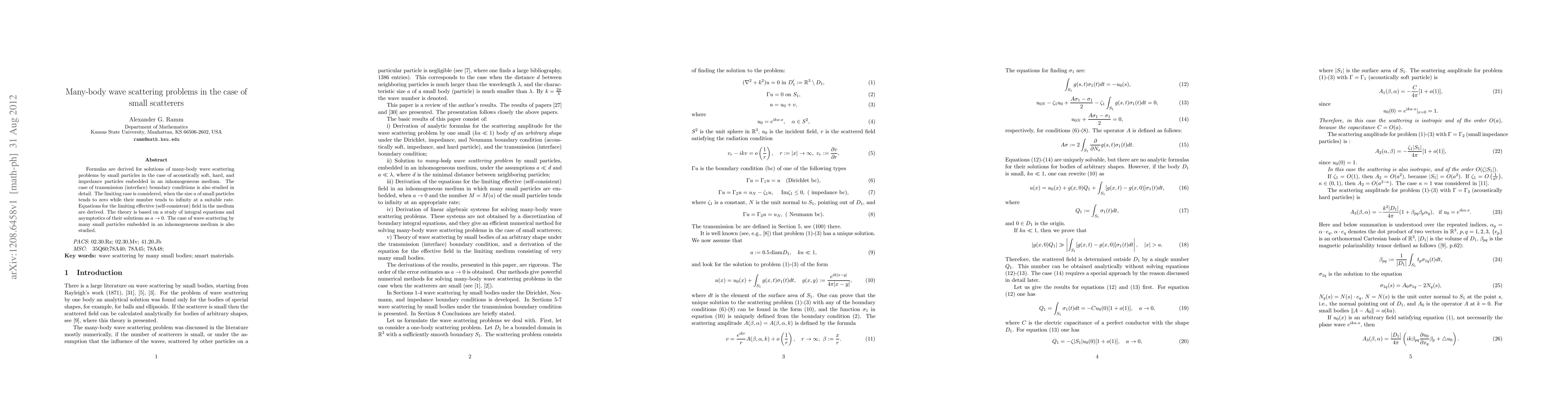 Formulas are derived for solutions of many-body wave scattering problems by small particles in the case of acoustically soft, hard, and impedance particles embedded in an inhomogeneous medium. The case of transmission (interface) boundary conditions is also studied in detail. The limiting case is considered, when the size $a$ of small particles tends to zero while their number tends to infinity at a suitable rate. Equations for the limiting effective (self-consistent) field in the medium are derived. The theory is based on a study of integral equations and asymptotics of their solutions as $a\to 0$. The case of wave scattering by many small particles embedded in an inhomogeneous medium is also studied.