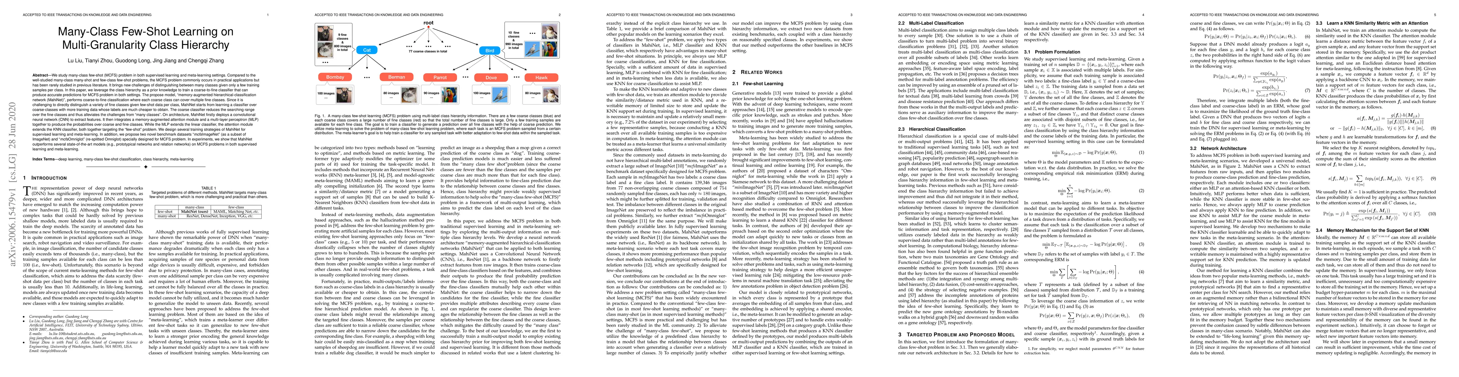 This research paper investigates the many-class few-shot (MCFS) learning problem, which involves distinguishing many classes from limited training samples per class. The proposed "memory-augmented hierarchical-classification network (MahiNet)" leverages a class hierarchy to perform coarse-to-fine classification, starting with coarse classes to reduce complexity and then refining to fine classes. The model combines CNN feature extraction, a memory-augmented attention module, and a multi-layer perceptron to address the few-shot challenge. The study also introduces new benchmark datasets for MCFS and demonstrates MahiNet's superior performance over existing models.