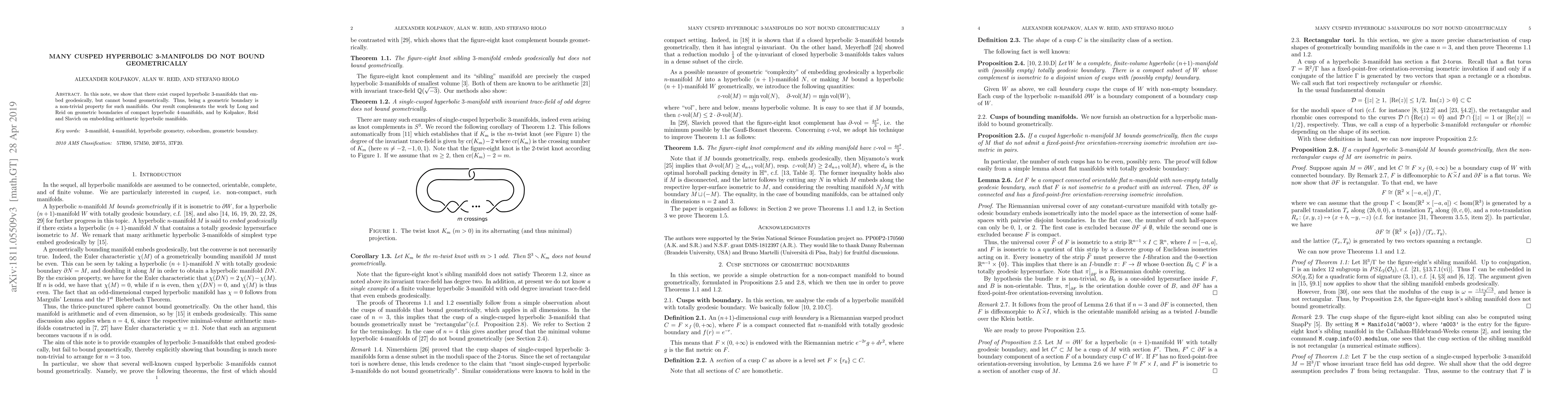 In this note, we show that there exist cusped hyperbolic $3$-manifolds that embed geodesically, but cannot bound geometrically. Thus, being a geometric boundary is a non-trivial property for such manifolds. Our result complements the work by Long and Reid on geometric boundaries of compact hyperbolic $4$-manifolds, and by Kolpakov, Reid and Slavich on embedding arithmetic hyperbolic manifolds.