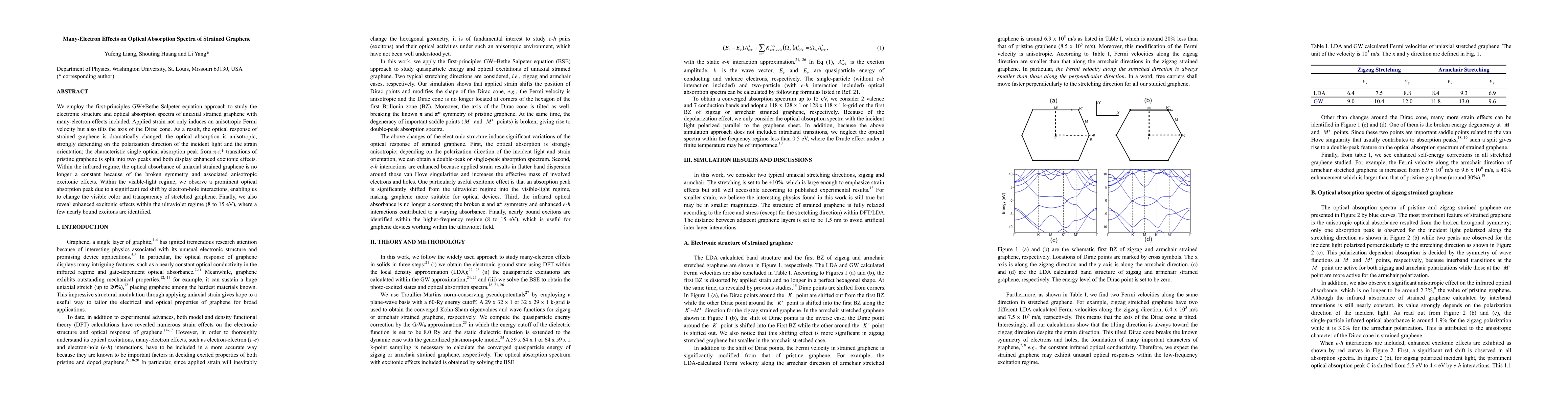 This paper investigates the impact of uniaxial strain on the optical absorption spectra of graphene using the GW+Bethe Salpeter equation, revealing anisotropic optical responses and splitting of the characteristic absorption peak due to many-electron effects, with significant implications for visible and ultraviolet light absorption.