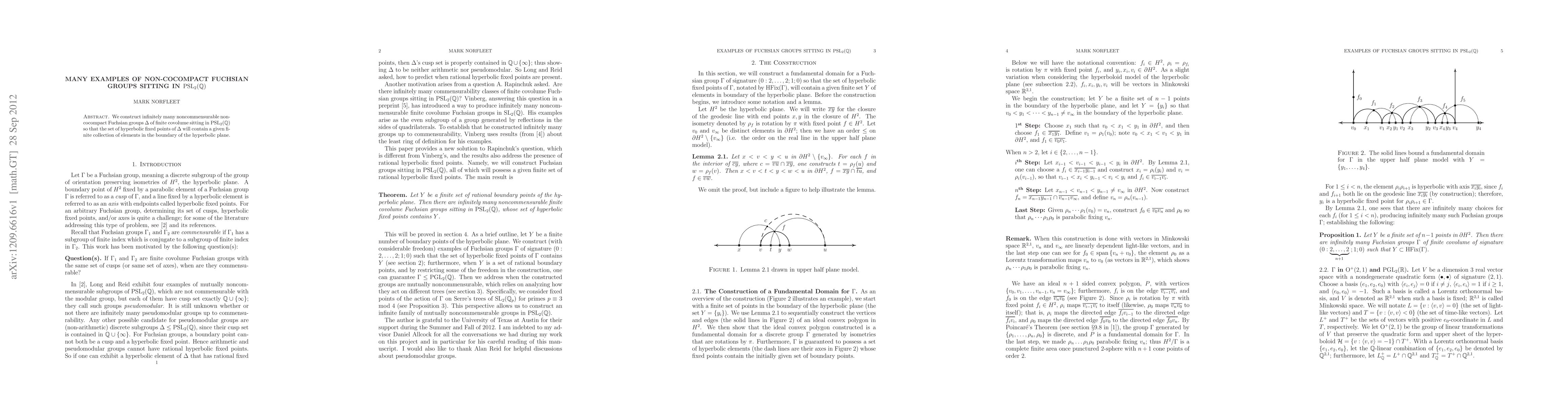 We construct infinitely many noncommensurable non-cocompact Fuchsian groups $\Delta$ of finite covolume sitting in PSL(2,Q) so that the set of hyperbolic fixed points of $\Delta$ will contain a given finite collection of elements in the boundary of the hyperbolic plane.