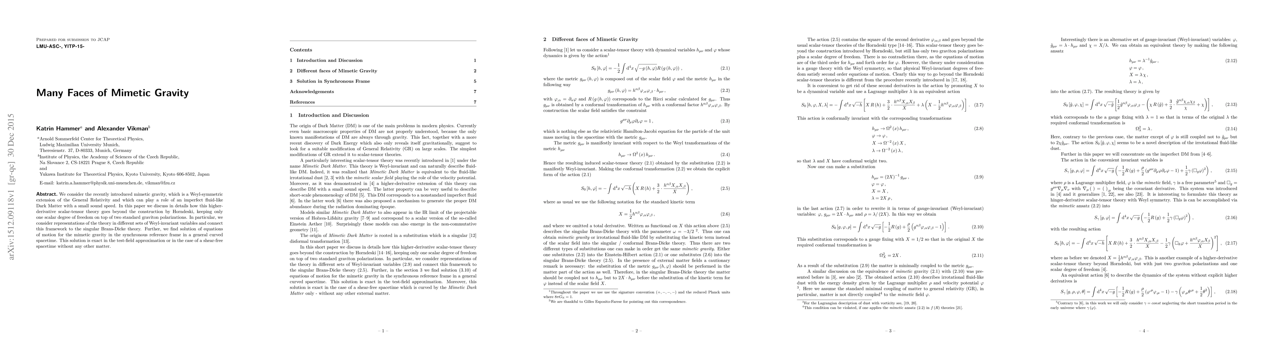 We consider the recently introduced mimetic gravity, which is a Weyl-symmetric extension of the General Relativity and which can play a role of an imperfect fluid-like Dark Matter with a small sound speed. In this paper we discuss in details how this higher- derivative scalar-tensor theory goes beyond the construction by Horndeski, keeping only one scalar degree of freedom on top of two standard graviton polarizations. In particular, we consider representations of the theory in different sets of Weyl-invariant variables and connect this framework to the singular Brans-Dicke theory. Further, we find solution of equations of motion for the mimetic gravity in the synchronous reference frame in a general curved spacetime. This solution is exact in the test-field approximation or in the case of a shear-free spacetime without any other matter.