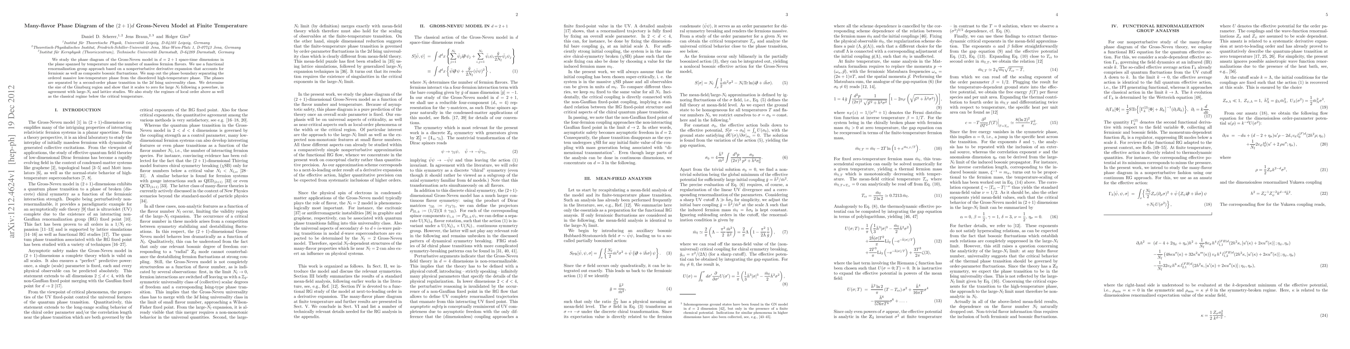 We study the phase diagram of the Gross-Neveu model in d=2+1 space-time dimensions in the plane spanned by temperature and the number of massless fermion flavors. We use a functional renormalization group approach based on a nonperturbative derivative expansion that accounts for fermionic as well as composite bosonic fluctuations. We map out the phase boundary separating the ordered massive low-temperature phase from the disordered high-temperature phase. The phases are separated by a second-order phase transition in the 2d Ising universality class. We determine the size of the Ginzburg region and show that it scales to zero for large $\Nf$ following a powerlaw, in agreement with large-$\Nf$ and lattice studies. We also study the regimes of local order above as well as the classical regime below the critical temperature.