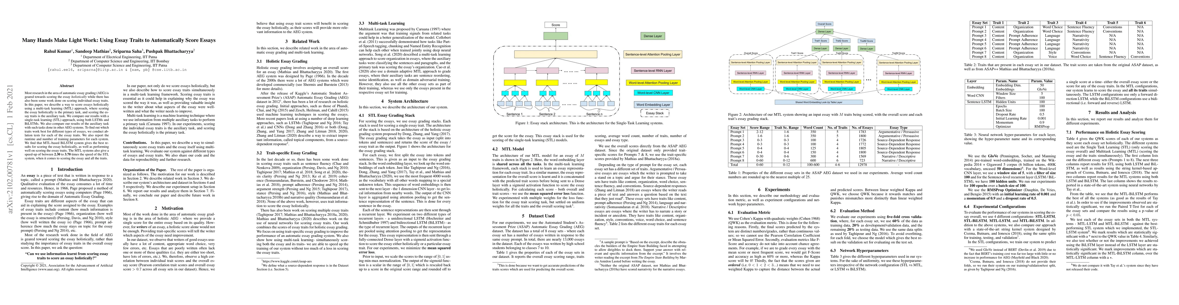 Most research in the area of automatic essay grading (AEG) is geared towards scoring the essay holistically while there has also been some work done on scoring individual essay traits. In this paper, we describe a way to score essays holistically using a multi-task learning (MTL) approach, where scoring the essay holistically is the primary task, and scoring the essay traits is the auxiliary task. We compare our results with a single-task learning (STL) approach, using both LSTMs and BiLSTMs. We also compare our results of the auxiliary task with such tasks done in other AEG systems. To find out which traits work best for different types of essays, we conduct ablation tests for each of the essay traits. We also report the runtime and number of training parameters for each system. We find that MTL-based BiLSTM system gives the best results for scoring the essay holistically, as well as performing well on scoring the essay traits.