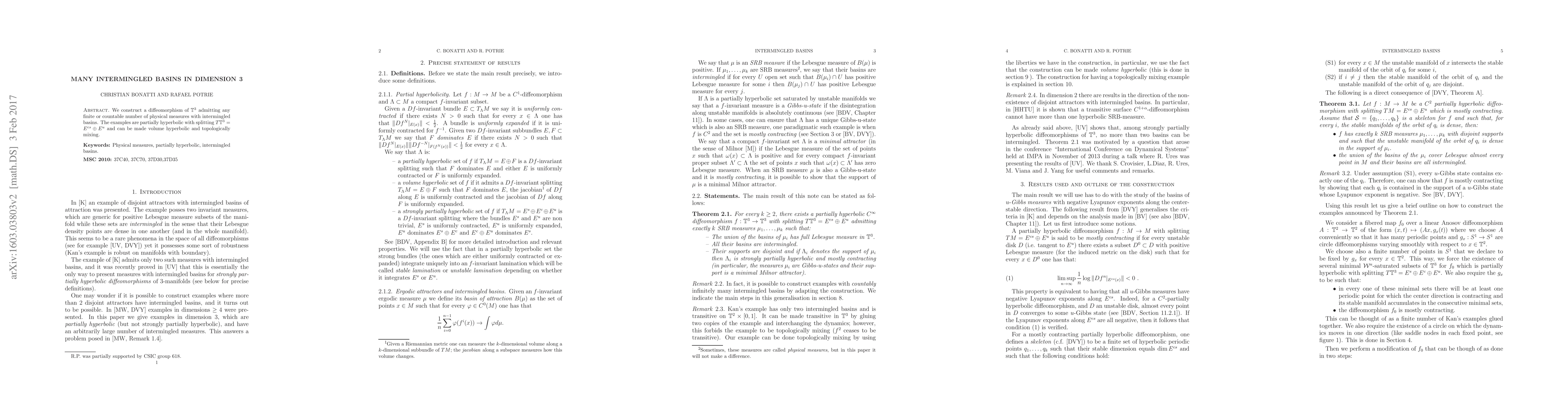 We construct a diffeomorphism of $\mathbb{T}^3$ admitting any finite or countable number of physical measures with intermingled basins. The examples are partially hyperbolic with splitting $T\mathbb{T}^3 = E^{cs} \oplus E^u$ and can be made volume hyperbolic and topologically mixing.