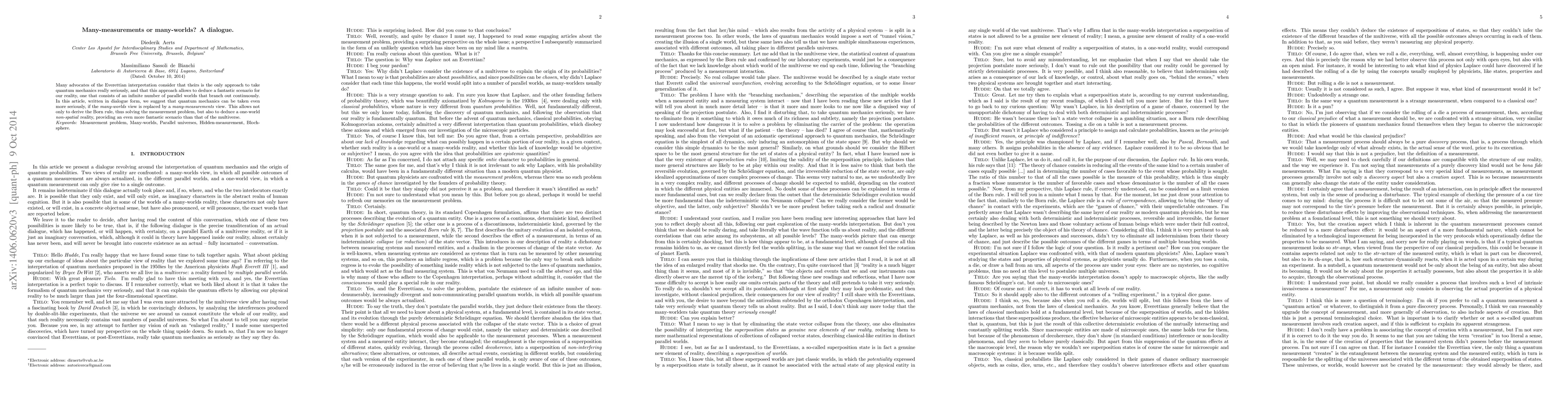 This paper argues that quantum mechanics can be interpreted more seriously through a 'many-measurements' approach rather than the 'many-worlds' interpretation, offering a one-world, non-spatial reality and solving the measurement problem. The dialogue form highlights the potential of this alternative view to provide an even more compelling scenario than the multiverse.
