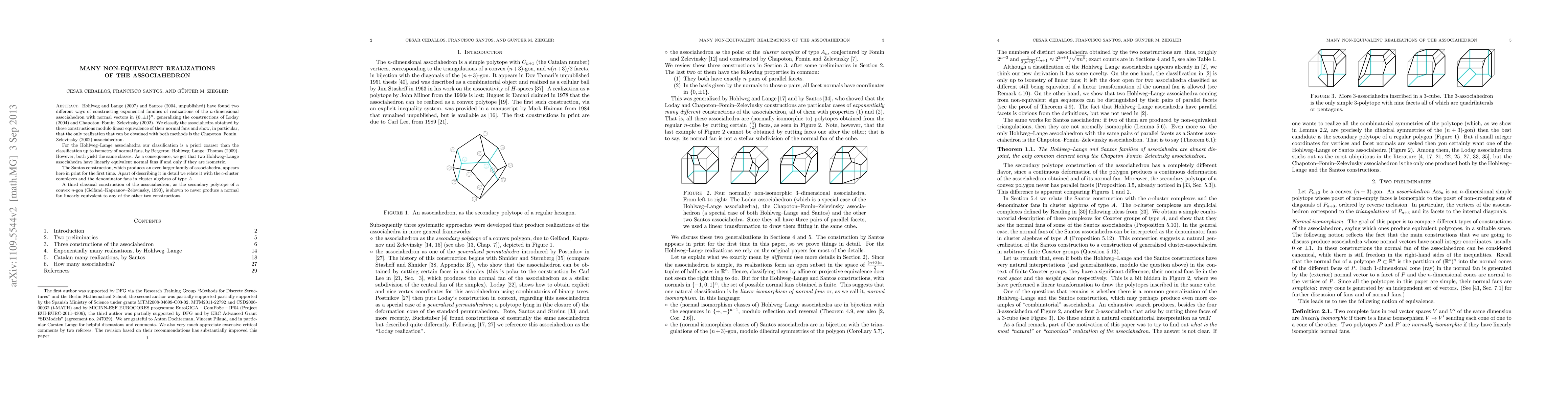 Hohlweg and Lange (2007) and Santos (2004, unpublished) have found two different ways of constructing exponential families of realizations of the n-dimensional associahedron with normal vectors in {0,1,-1}^n, generalizing the constructions of Loday (2004) and Chapoton-Fomin-Zelevinsky (2002). We classify the associahedra obtained by these constructions modulo linear equivalence of their normal fans and show, in particular, that the only realization that can be obtained with both methods is the Chapoton-Fomin-Zelevinsky (2002) associahedron. For the Hohlweg-Lange associahedra our classification is a priori coarser than the classification up to isometry of normal fans, by Bergeron-Hohlweg-Lange-Thomas (2009). However, both yield the same classes. As a consequence, we get that two Hohlweg-Lange associahedra have linearly equivalent normal fans if and only if they are isometric. The Santos construction, which produces an even larger family of associahedra, appears here in print for the first time. Apart of describing it in detail we relate it with the c-cluster complexes and the denominator fans in cluster algebras of type A. A third classical construction of the associahedron, as the secondary polytope of a convex n-gon (Gelfand-Kapranov-Zelevinsky, 1990), is shown to never produce a normal fan linearly equivalent to any of the other two constructions.