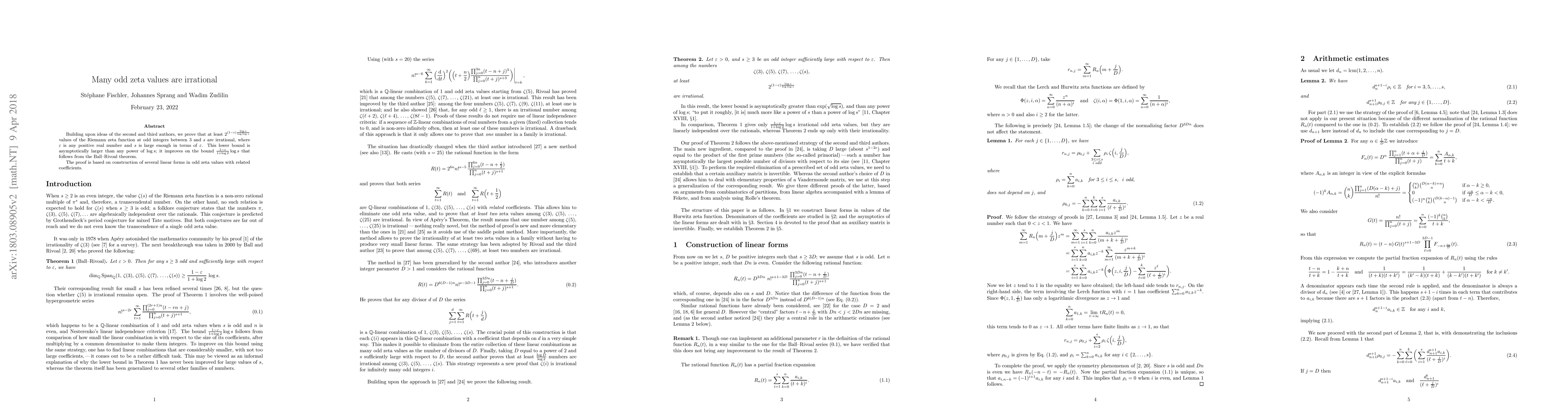 This paper proves that a significant number of odd zeta values are irrational, specifically at least $2^{(1-\varepsilon)\frac{\log s}{\log\log s}}$ values for large $s$, improving upon previous bounds. The proof utilizes the construction of linear forms in odd zeta values.