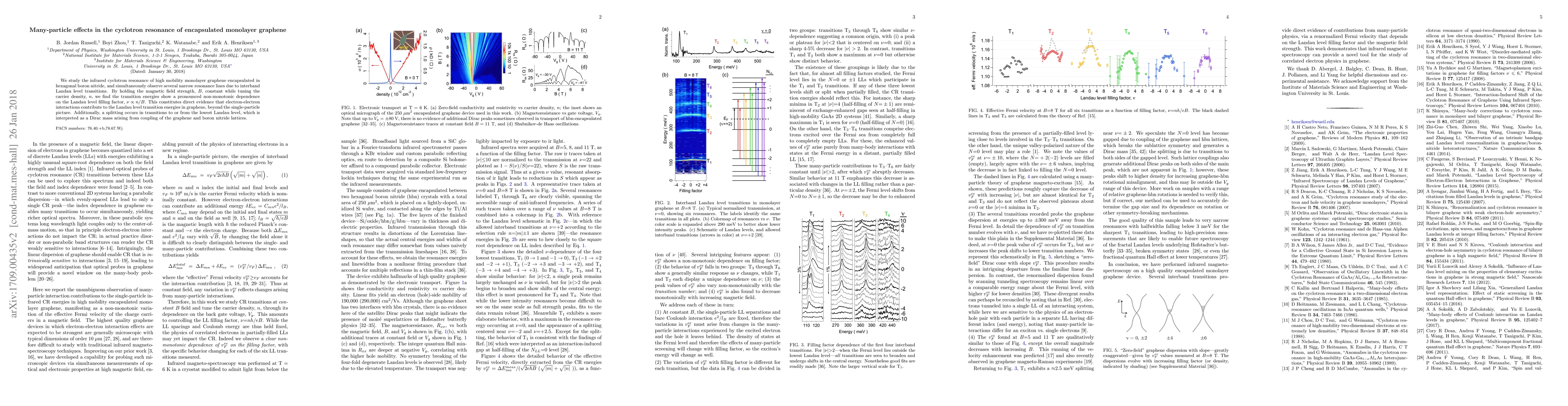 Summary: This study observes non-monotonic transition energies in encapsulated monolayer graphene's cyclotron resonance, revealing significant electron-electron interactions influencing Landau levels beyond single-particle theory. Additionally, a Dirac mass splitting in the lowest Landau level is identified, attributable to graphene-boron nitride lattice coupling.