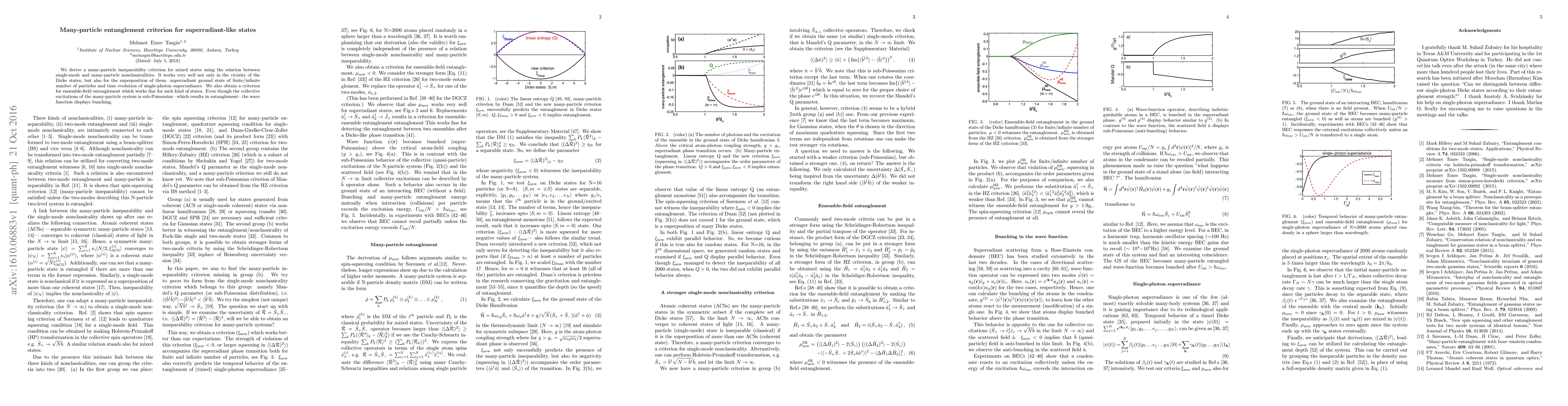 This paper derives a criterion for many-particle entanglement in superradiant-like states, showing its effectiveness near Dicke states and in single-photon superradiance. It also provides a criterion for ensemble-field entanglement, noting that while the system exhibits sub-Poissonian collective excitations leading to entanglement, the wave function still shows bunching.