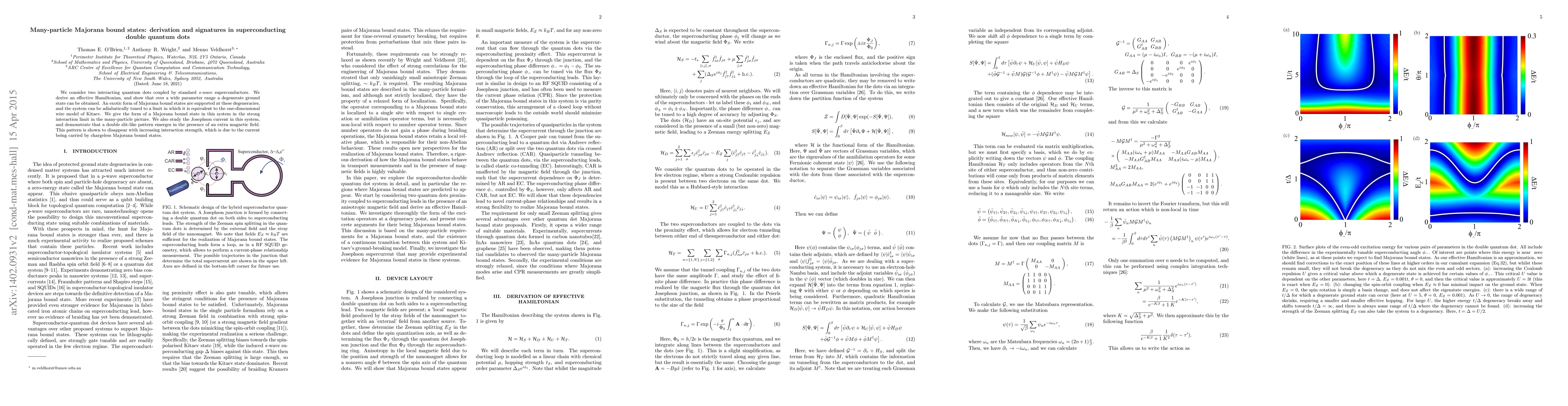 We consider two interacting quantum dots coupled by standard superconductors. We derive an effective Hamiltonian, and show that over a wide parameter range a degenerate ground state can be obtained. An exotique form of Majorana bound states are supported at these degeneracies, and the system can be adiabatically tuned to a limit in which it is equivalent to the one-dimensional wire model of Kitaev. We give the form of a Majorana bound state in this system in the strong interaction limit in the many-particle picture. We also study the Josephson current in this system, and demonstrate that a double slit-like pattern emerges in the presence of an extra magnetic field. This pattern is shown to disappear with increasing interaction strength, which is able to be explained as the current being carried by chargeless Majorana modes.