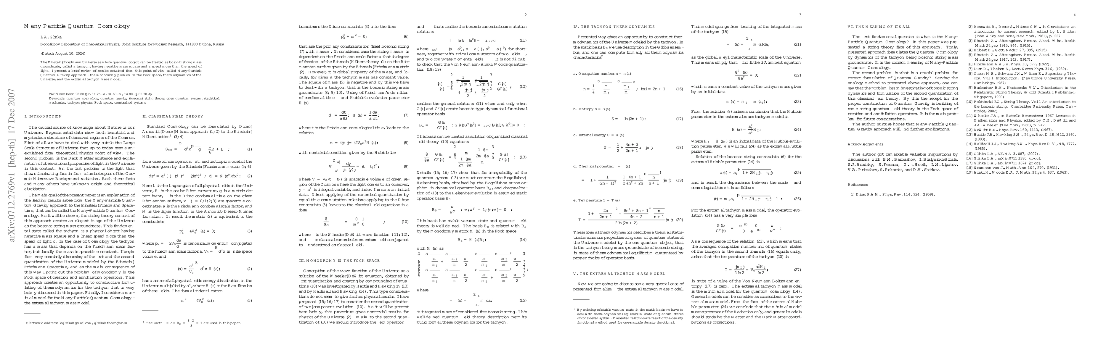 The Einstein-Friedmann Universe as whole quantum object can be treated as bosonic string mass groundstate, called a tachyon, having negative mass square and a speed more than the speed of light. I present a brief review of results obtained from this point of view called Many-Particle Quantum Gravity approach - the monodromy problem in the Fock space, thermodynamics of the Universe, and the extremal tachyon mass model.