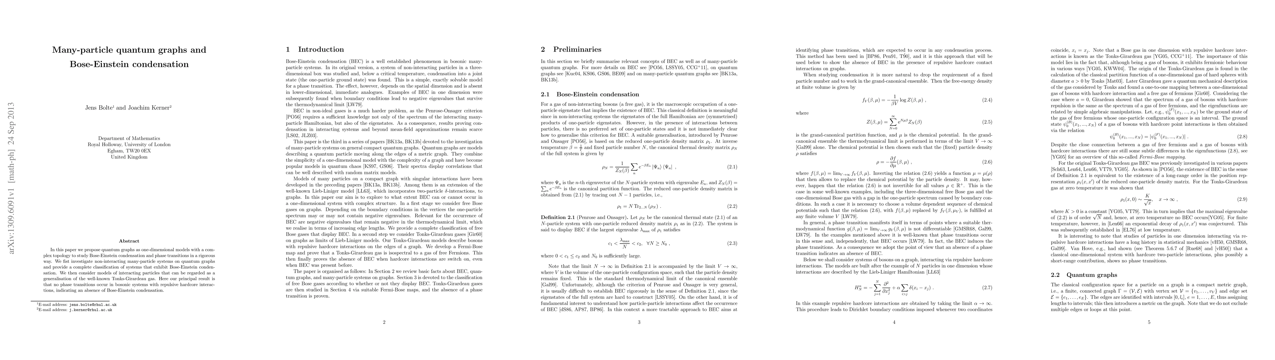 The paper proposes quantum graphs as models to study Bose-Einstein condensation and phase transitions, investigating both non-interacting and interacting many-particle systems rigorously.