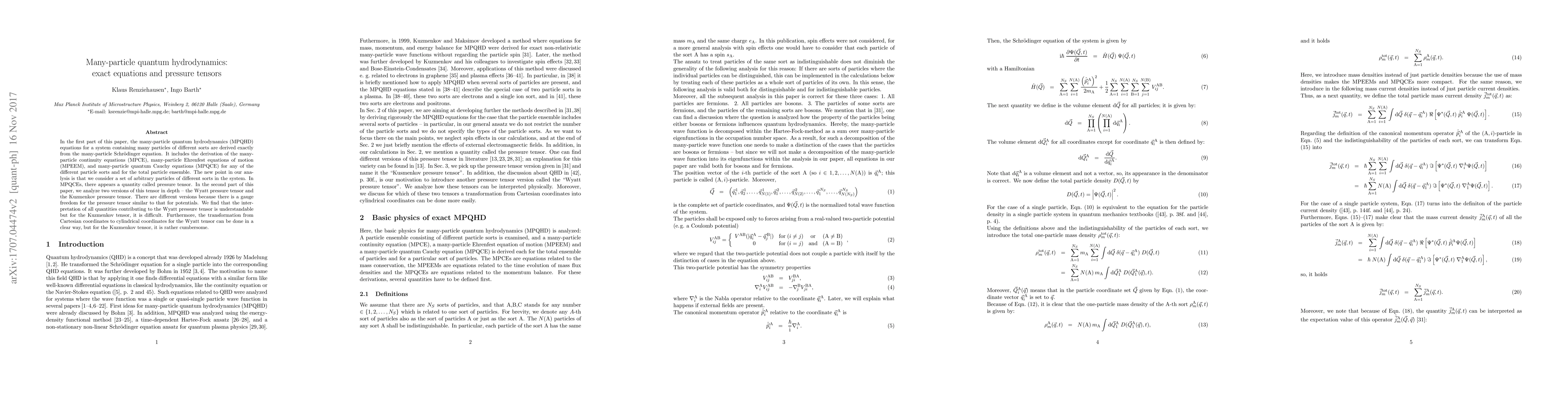 Researchers developed exact equations for many-particle quantum hydrodynamics, including pressure tensors, to study complex systems of different particles.