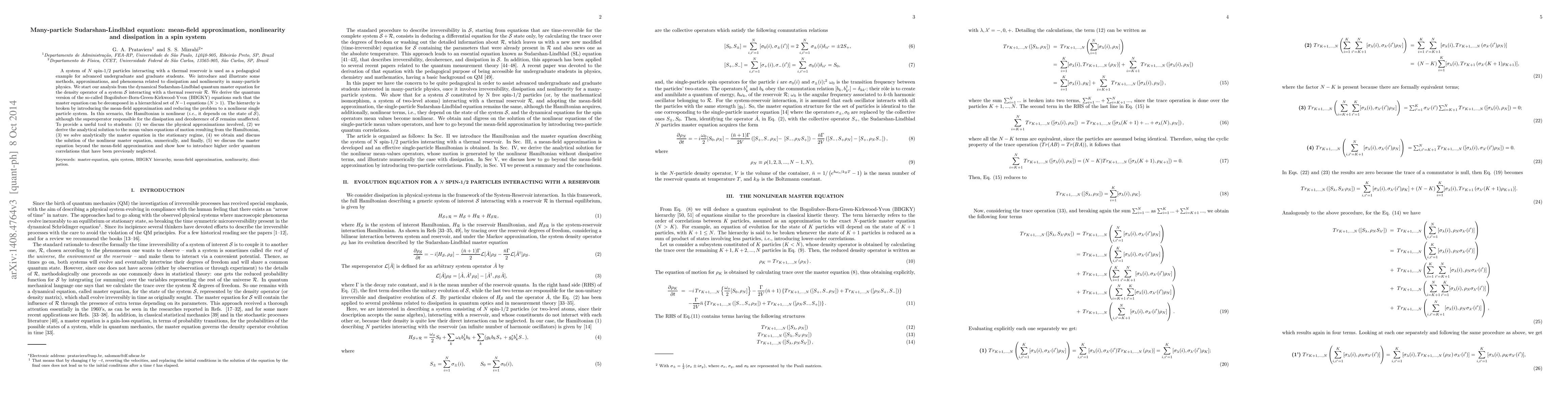 A system of $N$ spin-1/2 particles interacting with a thermal reservoir is used as a pedagogical example for advanced undergraduate and graduate students. We introduce and illustrate some methods, approximations, and phenomena related to dissipation and nonlinearity in many-particle physics. We start our analysis from the dynamical Sudarshan-Lindblad quantum master equation for the density operator of a system $\mathcal{S}$ interacting with a thermal reservoir $\mathcal{R}$. We derive the quantum version of the so-called Bogoliubov-Born-Green-Kirkwood-Yvon (BBGKY) equations such that the master equation can be decomposed in a hierarchical set of $N-1$ equations ($N>1$). The hierarchy is broken by introducing the mean-field approximation and reducing the problem to a nonlinear single particle system. In this scenario, the Hamiltonian is nonlinear (i.e., it depends on the state of $\mathcal{S}$), although the superoperator responsible for the dissipation and decoherence of $\mathcal{S}$ remains unaffected. To provide a useful tool to students: (1) we discuss the physical approximations involved, (2) we derive the analytical solution to the mean values equations of motion resulting from the Hamiltonian, (3) we solve analytically the master equation in the stationary regime, (4) we obtain and discuss the solution of the nonlinear master equation, numerically, and finally, (5) we discuss the master equation beyond the mean-field approximation and show how to introduce higher order quantum correlations that have been previously neglected.