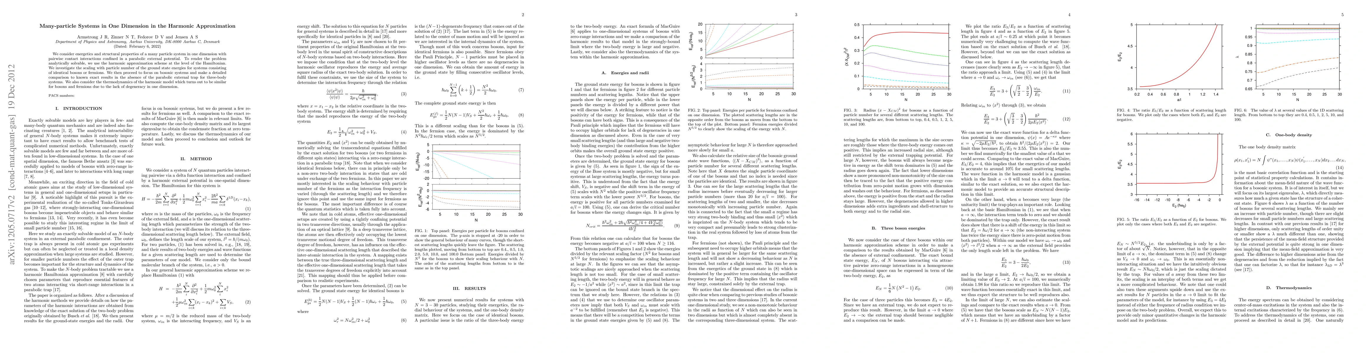 This paper studies the behavior of many-particle systems in one dimension under a parabolic external potential using the harmonic approximation scheme. It finds that the ground state energies scale similarly for bosons and fermions due to lack of degeneracy in one dimension.