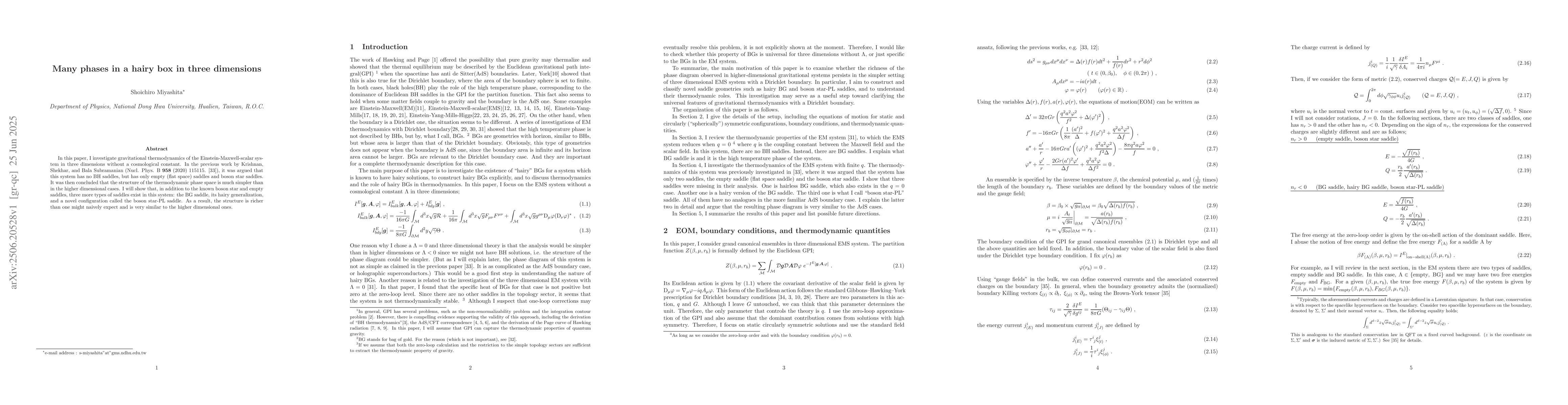 In this paper, I investigate gravitational thermodynamics of the Einstein-Maxwell-scalar system in three dimensions without a cosmological constant. In the previous work by Krishnan,Shekhar, and Bala Subramanian (Nucl. Phys. B 958 (2020) 115115 [33]), it was argued that this system has no BH saddles, but has only empty (flat space) saddles and boson star saddles. It was then concluded that the structure of the thermodynamic phase space is much simpler than in the higher dimensional cases. I will show that, in addition to the known boson star and empty saddles, three more types of saddles exist in this system: the BG saddle, its hairy generalization, and a novel configuration called the boson star-PL saddle. As a result, the structure is richer than one might naively expect and is very similar to the higher dimensional ones.