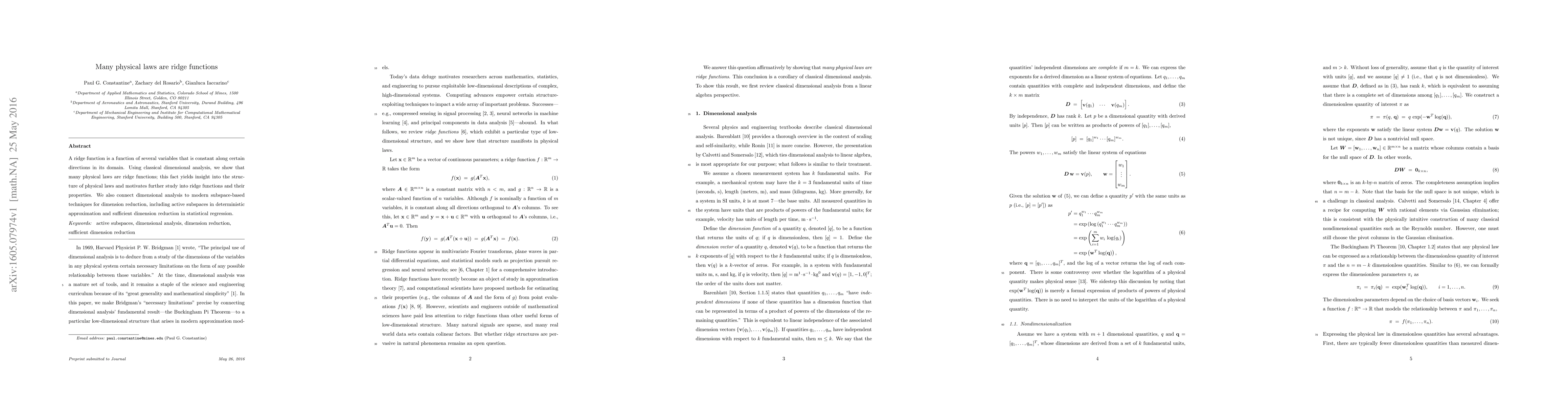This paper demonstrates that many physical laws can be modeled as ridge functions, revealing their underlying structural properties. It connects classical dimensional analysis with modern subspace-based dimension reduction techniques, suggesting new avenues for exploring these functions.