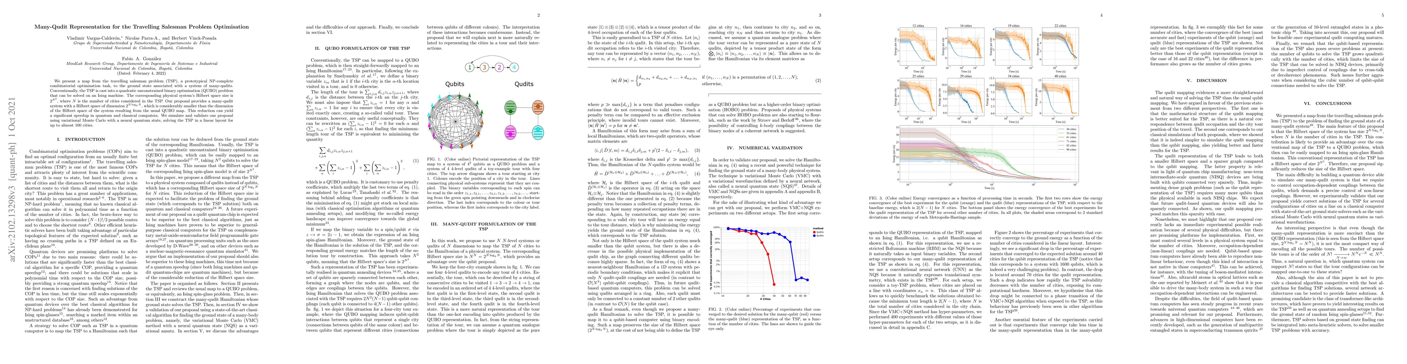 This paper proposes a many-qudit representation for the Travelling Salesman Problem (TSP) that reduces the problem's Hilbert space dimension from $2^{N^2}$ to $2^{N\log_2N}$, potentially offering a significant computational speedup over traditional QUBO methods. The authors validate their approach using variational Monte Carlo simulations for TSP instances with up to nearly 100 cities.