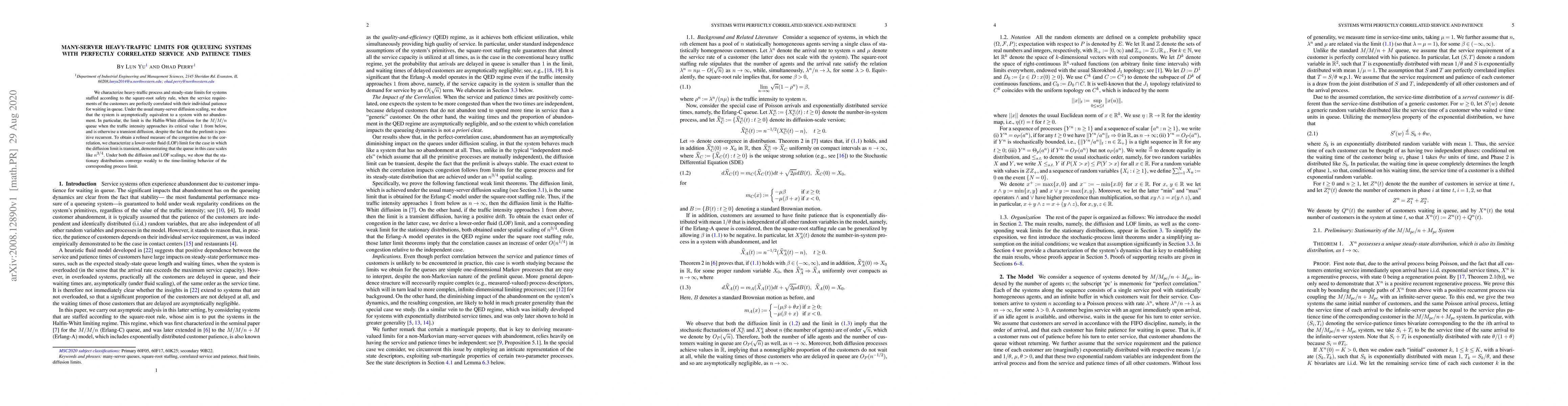 This paper studies heavy-traffic limits for queueing systems where service times and patience times are perfectly correlated, showing that under many-server scaling, the system behaves like a non-abandoning $M/M/n$ queue near critical traffic intensity. It also introduces a lower-order fluid limit for transient cases, revealing a $n^{3/4}$ scaling of the queue.