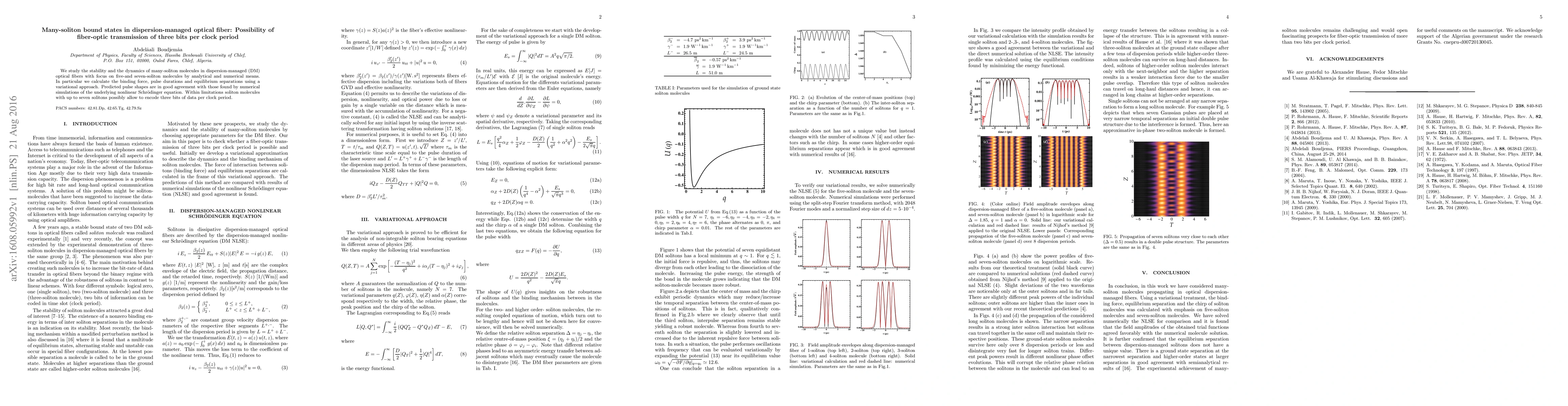 This paper investigates the stability and dynamics of multi-soliton molecules in dispersion-managed optical fibers, finding that five- and seven-soliton molecules can potentially encode three bits per clock period. The study uses a variational approach to calculate binding forces and pulse characteristics, with results corroborated by numerical simulations.