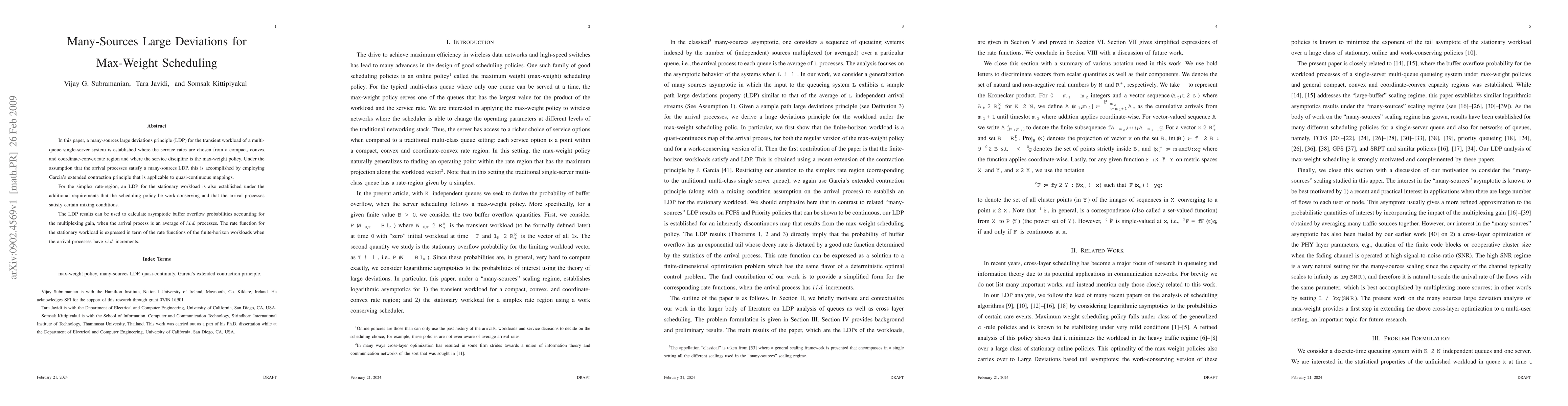 In this paper, a many-sources large deviations principle (LDP) for the transient workload of a multi-queue single-server system is established where the service rates are chosen from a compact, convex and coordinate-convex rate region and where the service discipline is the max-weight policy. Under the assumption that the arrival processes satisfy a many-sources LDP, this is accomplished by employing Garcia's extended contraction principle that is applicable to quasi-continuous mappings. For the simplex rate-region, an LDP for the stationary workload is also established under the additional requirements that the scheduling policy be work-conserving and that the arrival processes satisfy certain mixing conditions. The LDP results can be used to calculate asymptotic buffer overflow probabilities accounting for the multiplexing gain, when the arrival process is an average of \emph{i.i.d.} processes. The rate function for the stationary workload is expressed in term of the rate functions of the finite-horizon workloads when the arrival processes have \emph{i.i.d.} increments.
