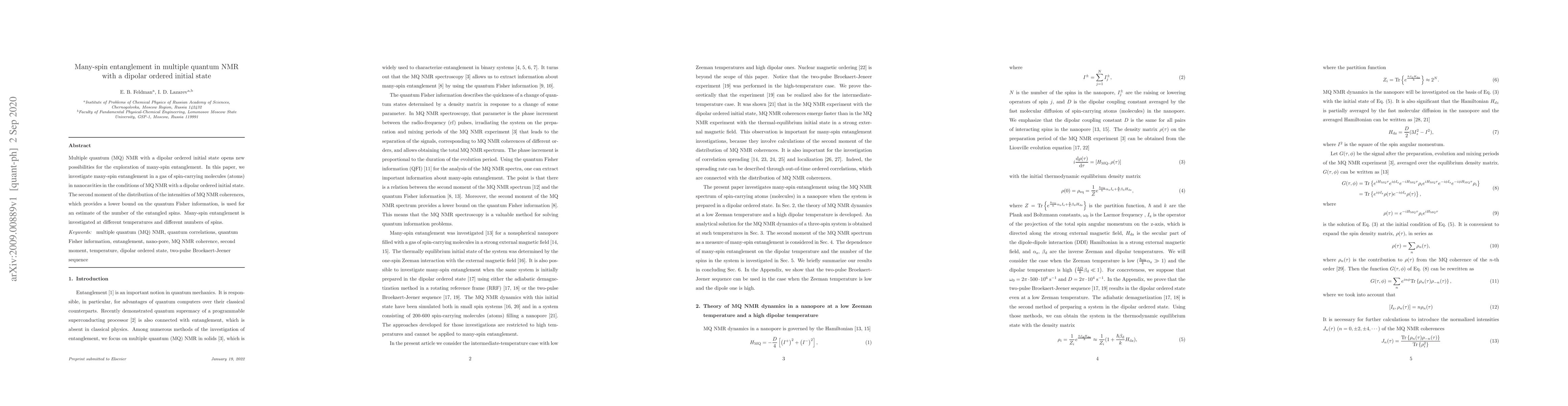 This paper explores many-spin entanglement in a gas of spin-carrying molecules using multiple quantum NMR with a dipolar ordered initial state. The study estimates the number of entangled spins using the second moment of MQ NMR coherence intensities, examining entanglement at various temperatures and spin counts.