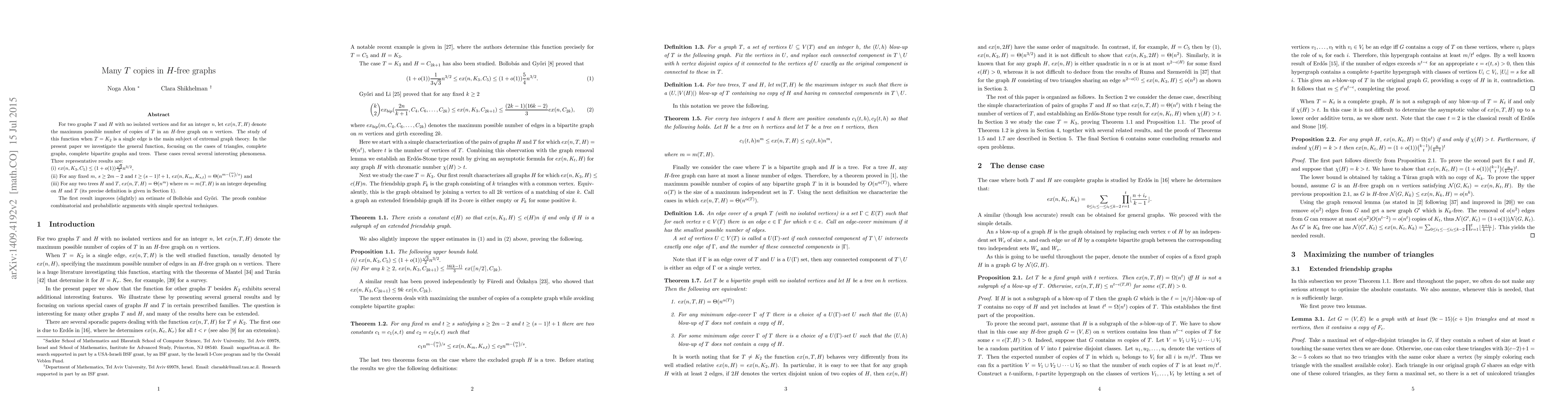 This paper investigates the extremal function $ex(n,T,H)$ for various graph $T$ and $H$, focusing on triangles, complete graphs, complete bipartite graphs, and trees. It presents significant results including $ex(n,K_3,C_5) \leq (1+o(1)) \frac{\sqrt 3}{2} n^{3/2}$, and $ex(n,K_m,K_{s,t})=\Theta(n^{m-\binom{m}{2}/s})$ for fixed $m$, $s$, and $t$. The proofs utilize a mix of combinatorial, probabilistic, and spectral techniques.