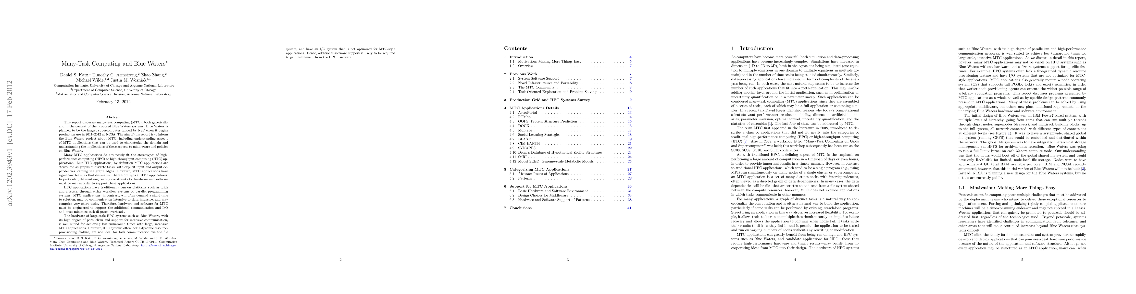 This report discusses many-task computing (MTC) generically and in the context of the proposed Blue Waters systems, which is planned to be the largest NSF-funded supercomputer when it begins production use in 2012. The aim of this report is to inform the BW project about MTC, including understanding aspects of MTC applications that can be used to characterize the domain and understanding the implications of these aspects to middleware and policies. Many MTC applications do not neatly fit the stereotypes of high-performance computing (HPC) or high-throughput computing (HTC) applications. Like HTC applications, by definition MTC applications are structured as graphs of discrete tasks, with explicit input and output dependencies forming the graph edges. However, MTC applications have significant features that distinguish them from typical HTC applications. In particular, different engineering constraints for hardware and software must be met in order to support these applications. HTC applications have traditionally run on platforms such as grids and clusters, through either workflow systems or parallel programming systems. MTC applications, in contrast, will often demand a short time to solution, may be communication intensive or data intensive, and may comprise very short tasks. Therefore, hardware and software for MTC must be engineered to support the additional communication and I/O and must minimize task dispatch overheads. The hardware of large-scale HPC systems, with its high degree of parallelism and support for intensive communication, is well suited for MTC applications. However, HPC systems often lack a dynamic resource-provisioning feature, are not ideal for task communication via the file system, and have an I/O system that is not optimized for MTC-style applications. Hence, additional software support is likely to be required to gain full benefit from the HPC hardware.