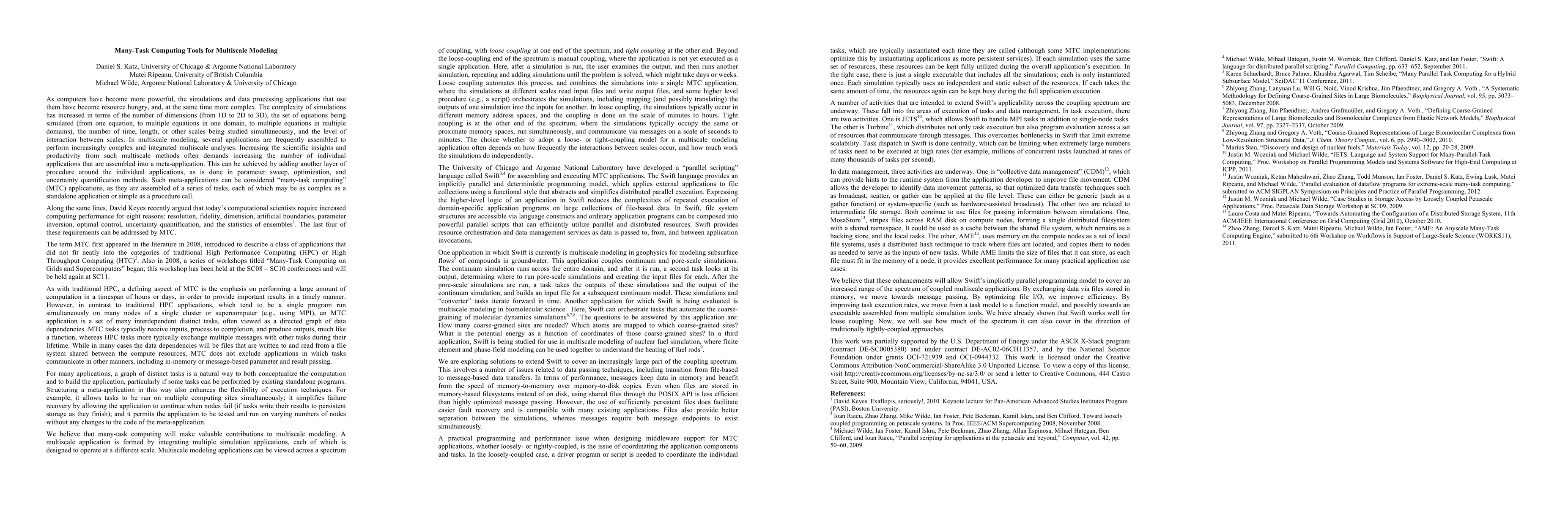 This paper explores the application of many-task computing tools, specifically the Swift parallel scripting language, for multiscale modeling. It extends the Swift model to better cover a wide range of multiscale modeling coupling scenarios through various applications.