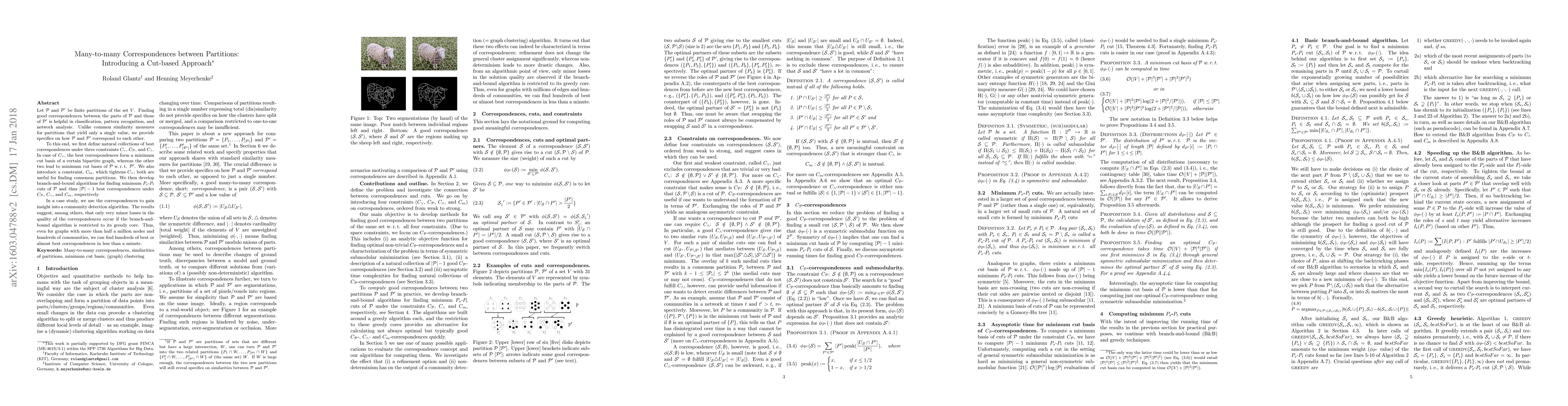 Let $\mathcal{P}$ and $\mathcal{P}'$ be finite partitions of the set $V$. Finding good correspondences between the parts of $\mathcal{P}$ and those of $\mathcal{P}'$ is helpful in classification, pattern recognition, and network analysis. Unlike common similarity measures for partitions that yield only a single value, we provide specifics on how $\mathcal{P}$ and $\mathcal{P'}$ correspond to each other. To this end, we first define natural collections of best correspondences under three constraints \cone, \ctwo, and \cthree. In case of \cone, the best correspondences form a minimum cut basis of a certain bipartite graph, whereas the other two lead to minimum cut bases of $\mathcal{P}$ \wrt $\mathcal{P}'$. We also introduce a constraint, \cfour, which tightens \cthree; both are useful for finding consensus partitions. We then develop branch-and-bound algorithms for finding minimum $P_s$-$P_t$ cuts of $\mathcal{P}$ and thus $\vert \mathcal{P} \vert -1$ best correspondences under \ctwo, \cthree, and \cfour, respectively. In a case study, we use the correspondences to gain insight into a community detection algorithm. The results suggest, among others, that only very minor losses in the quality of the correspondences occur if the branch-and-bound algorithm is restricted to its greedy core. Thus, even for graphs with more than half a million nodes and hundreds of communities, we can find hundreds of best or almost best correspondences in less than a minute.