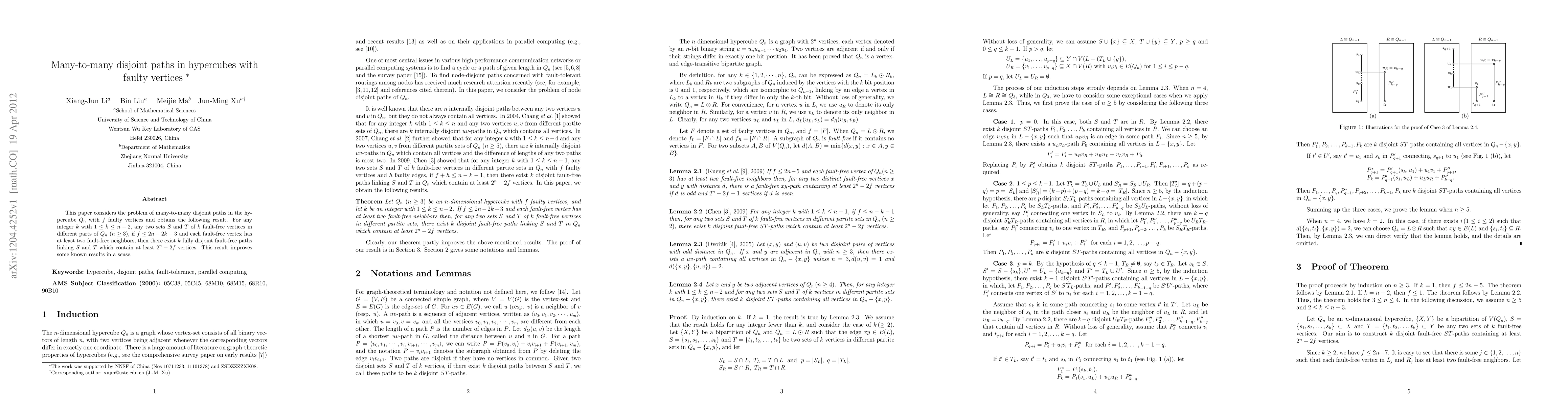 This paper investigates many-to-many disjoint paths in hypercubes with faulty vertices, proving that under certain conditions, $k$ disjoint fault-free paths can be found for any $k$ with $1\leq k\leq n-2$, improving upon existing results.