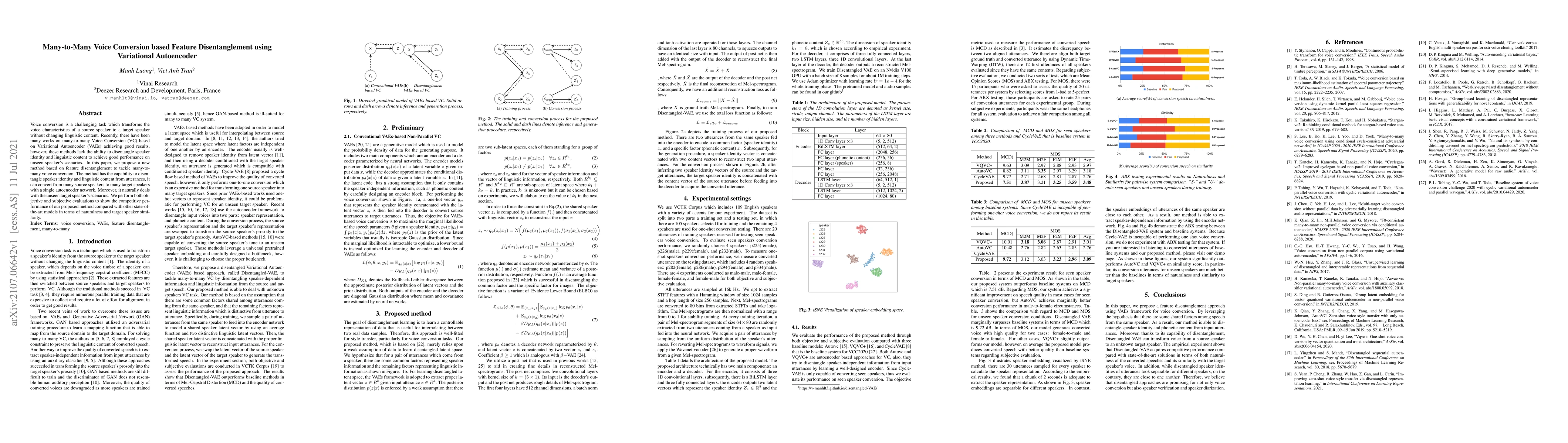 This paper proposes a new method for many-to-many voice conversion using feature disentanglement with a Variational Autoencoder (VAE) to separate speaker identity and linguistic content, achieving competitive performance in unseen target speaker scenarios. The method demonstrates superior naturalness and target speaker similarity compared to state-of-the-art models.