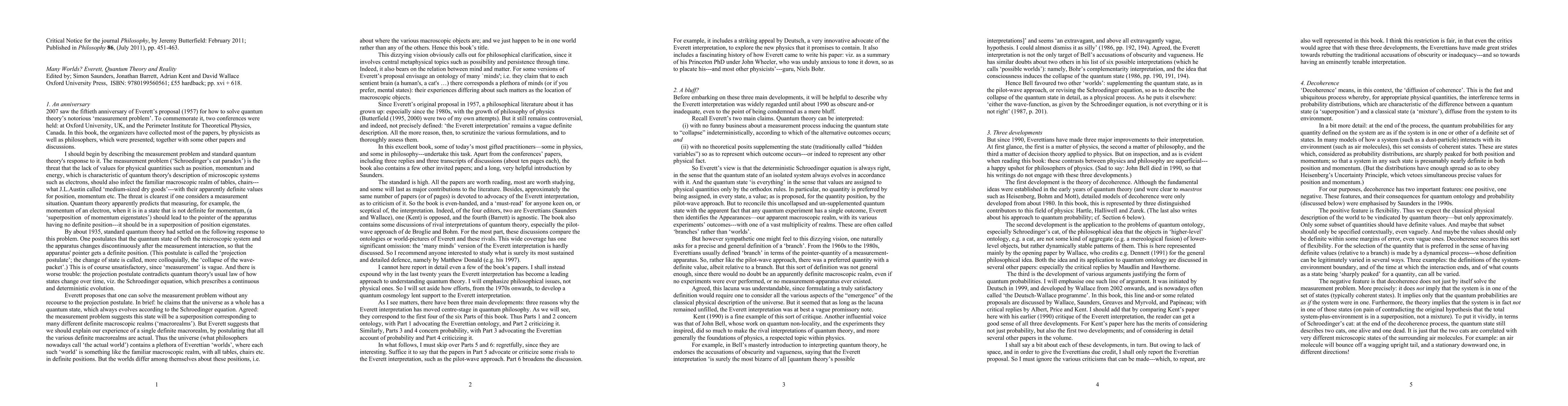 This anthology critically examines Hugh Everett's Many-Worlds Interpretation of quantum mechanics, exploring its implications for our understanding of reality and its philosophical ramifications within the framework of quantum theory. The contributions from leading scholars provide a comprehensive overview of the current debates surrounding this interpretation.