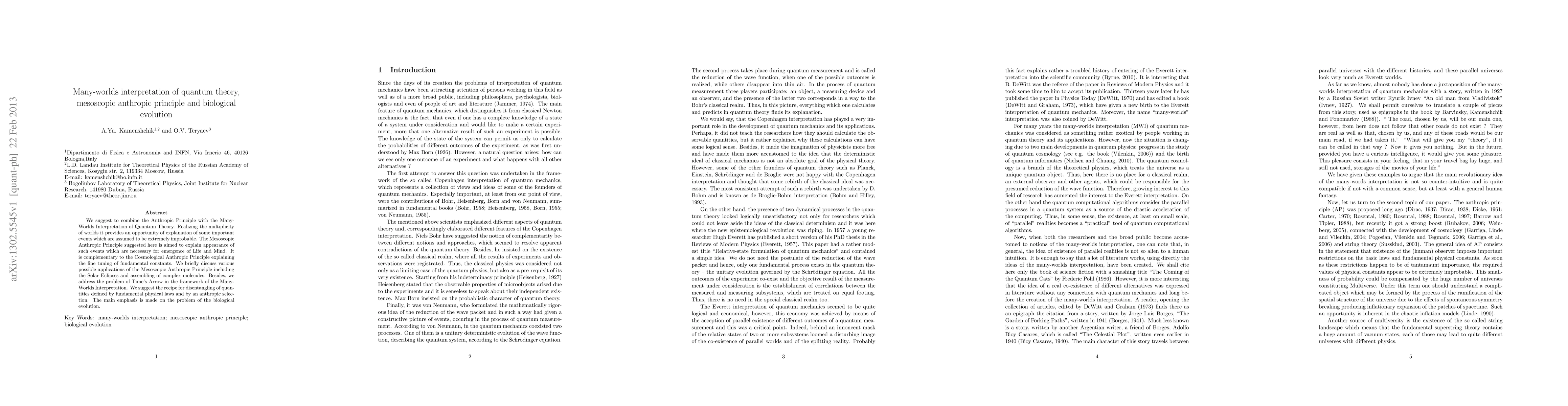 This paper combines the Many-Worlds Interpretation of Quantum Theory with the Anthropic Principle to explain improbable events necessary for life and mind emergence, termed the Mesoscopic Anthropic Principle. It also addresses the problem of Time's Arrow and biological evolution within this framework.