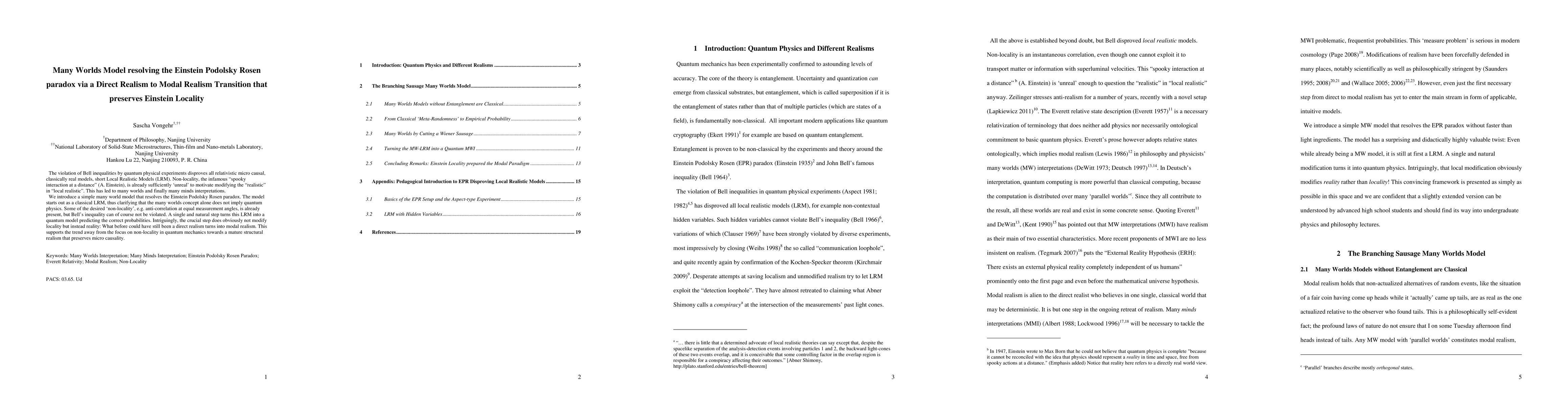 The violation of Bell inequalities by quantum physical experiments disproves all relativistic micro causal, classically real models, short Local Realistic Models (LRM). Non-locality, the infamous "spooky interaction at a distance" (A. Einstein), is already sufficiently 'unreal' to motivate modifying the "realistic" in "local realistic". This has led to many worlds and finally many minds interpretations. We introduce a simple many world model that resolves the Einstein Podolsky Rosen paradox. The model starts out as a classical LRM, thus clarifying that the many worlds concept alone does not imply quantum physics. Some of the desired non-locality, e.g. anti-correlation at equal measurement angles, is already present, but Bell's inequality can of course not be violated. A single and natural step turns this LRM into a quantum model predicting the correct probabilities. Intriguingly, the crucial step does obviously not modify locality but instead reality: What before could have still been a direct realism turns into modal realism. This supports the trend away from the focus on non-locality in quantum mechanics towards a mature structural realism that preserves micro causality.