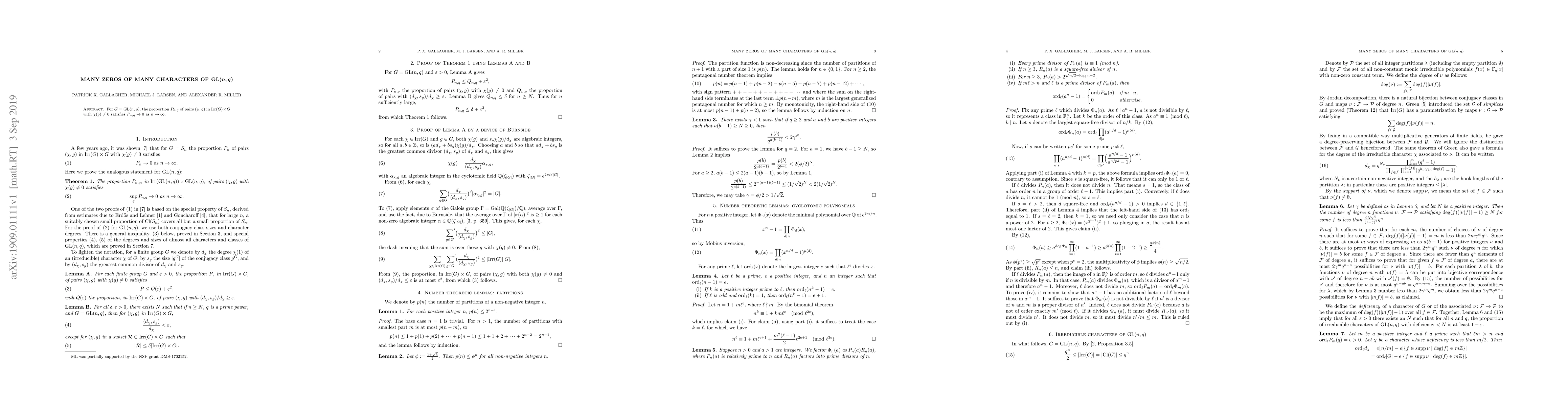 For $G={\rm GL}(n,q)$, the proportion $P_{n,q}$ of pairs $(\chi,g)$ in ${\rm Irr}(G)\times G$ with $\chi(g)\neq 0$ satisfies $P_{n,q}\to 0$ as $n\to\infty$.